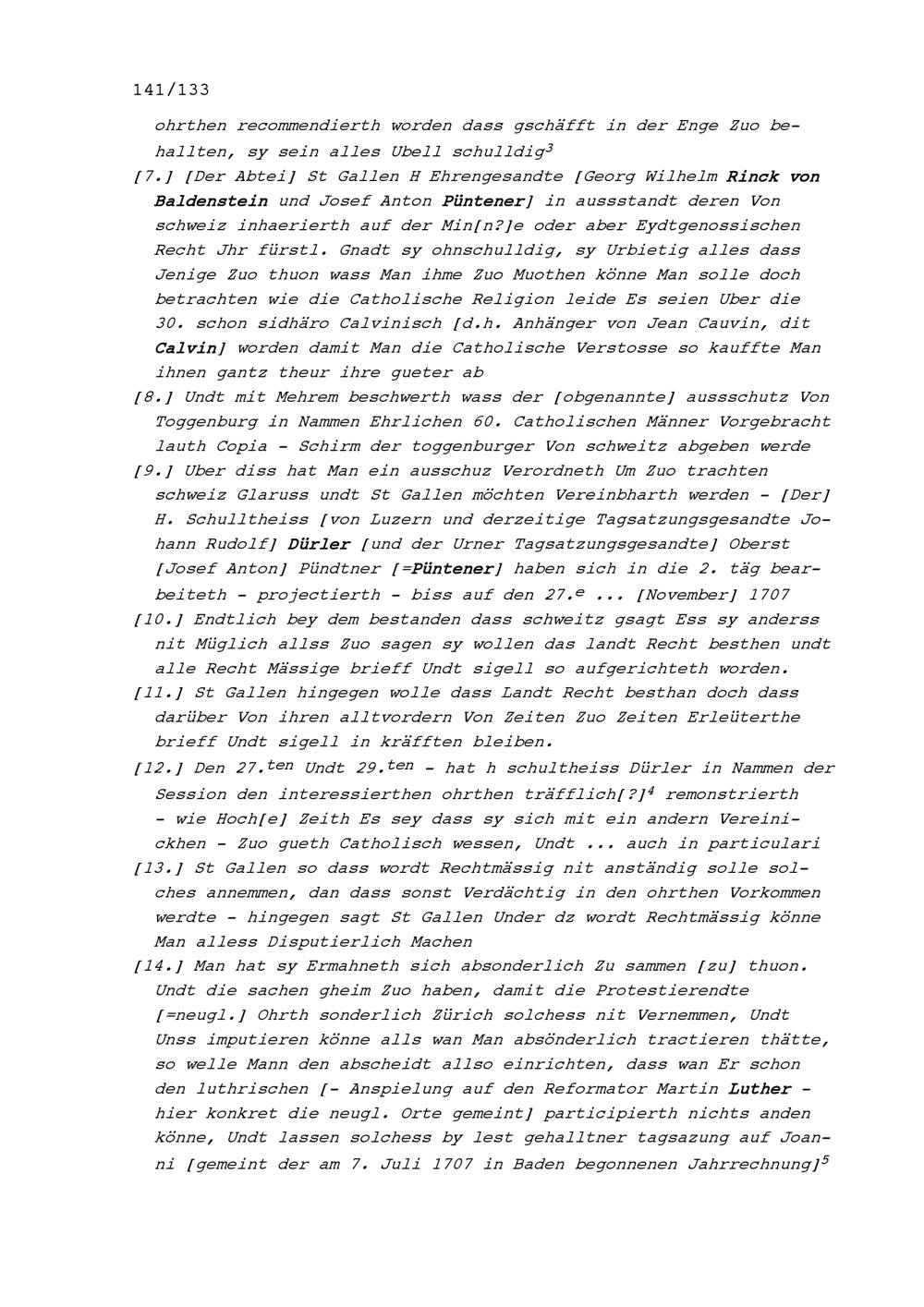 Notiz von Beat Jakob II. Zurlauben, Tagsatzungsgesandter von Stadt und Amt Zug, unter anderem an der Tagsatzung der Neun Katholischen Orte sowie der Abtei Sankt Gallen vom 23. und 24. und vom 26. bis 29. November 1707 in Luzern