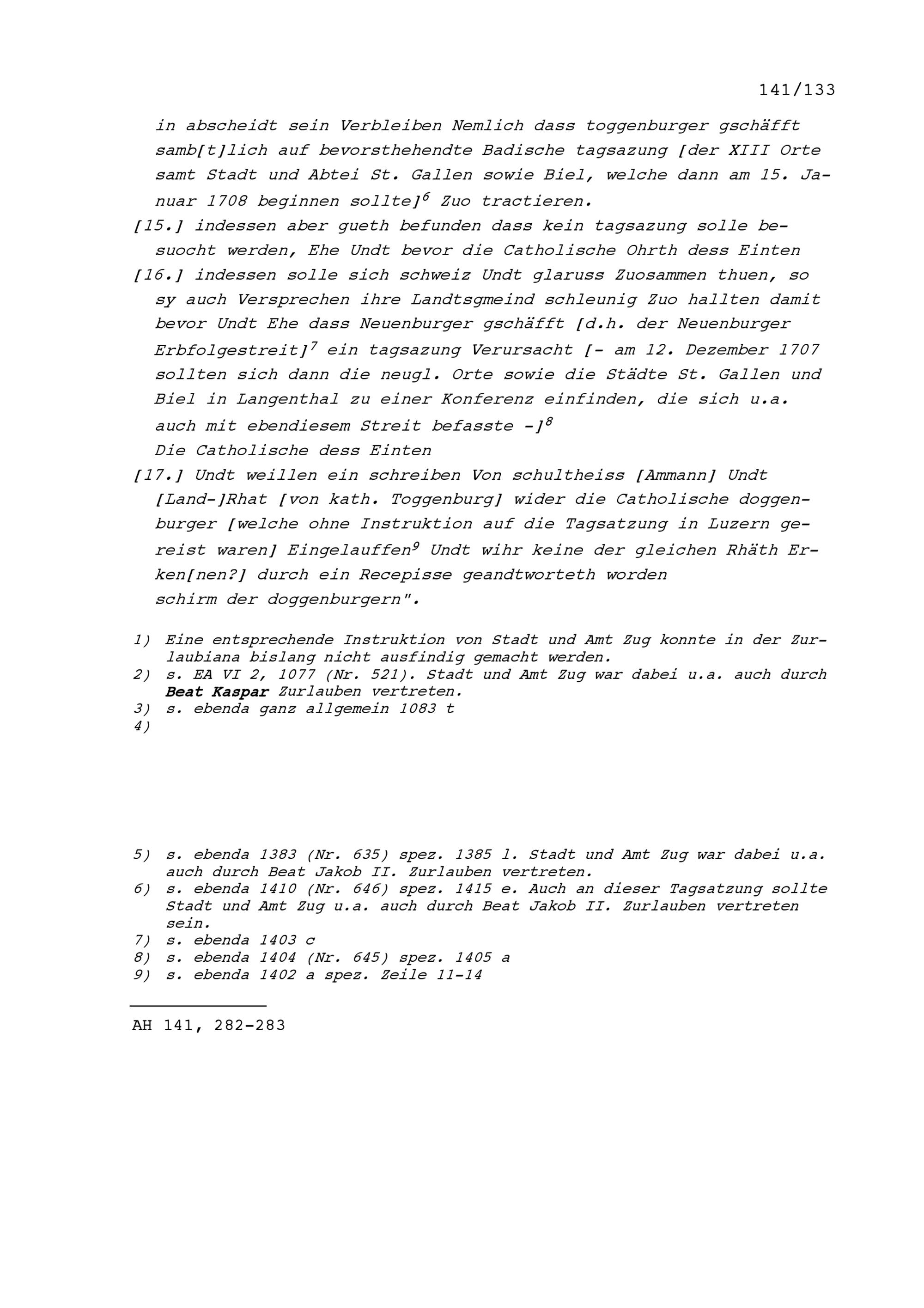 Notiz von Beat Jakob II. Zurlauben, Tagsatzungsgesandter von Stadt und Amt Zug, unter anderem an der Tagsatzung der Neun Katholischen Orte sowie der Abtei Sankt Gallen vom 23. und 24. und vom 26. bis 29. November 1707 in Luzern