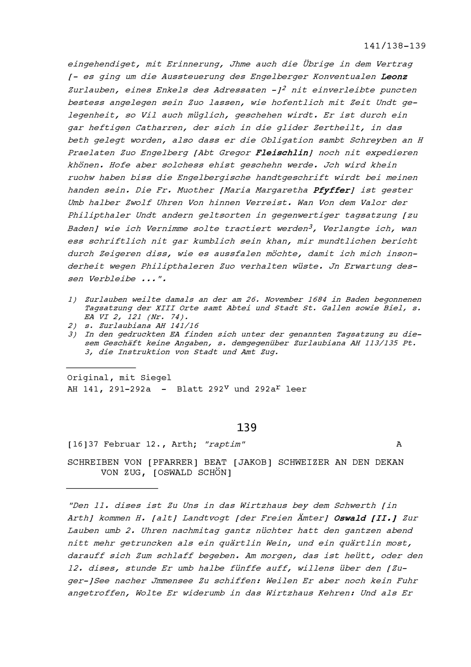 Schreiben von Beat Jakob Schweizer, Pfarrer, an Oswald Schön, Dekan von Zug,