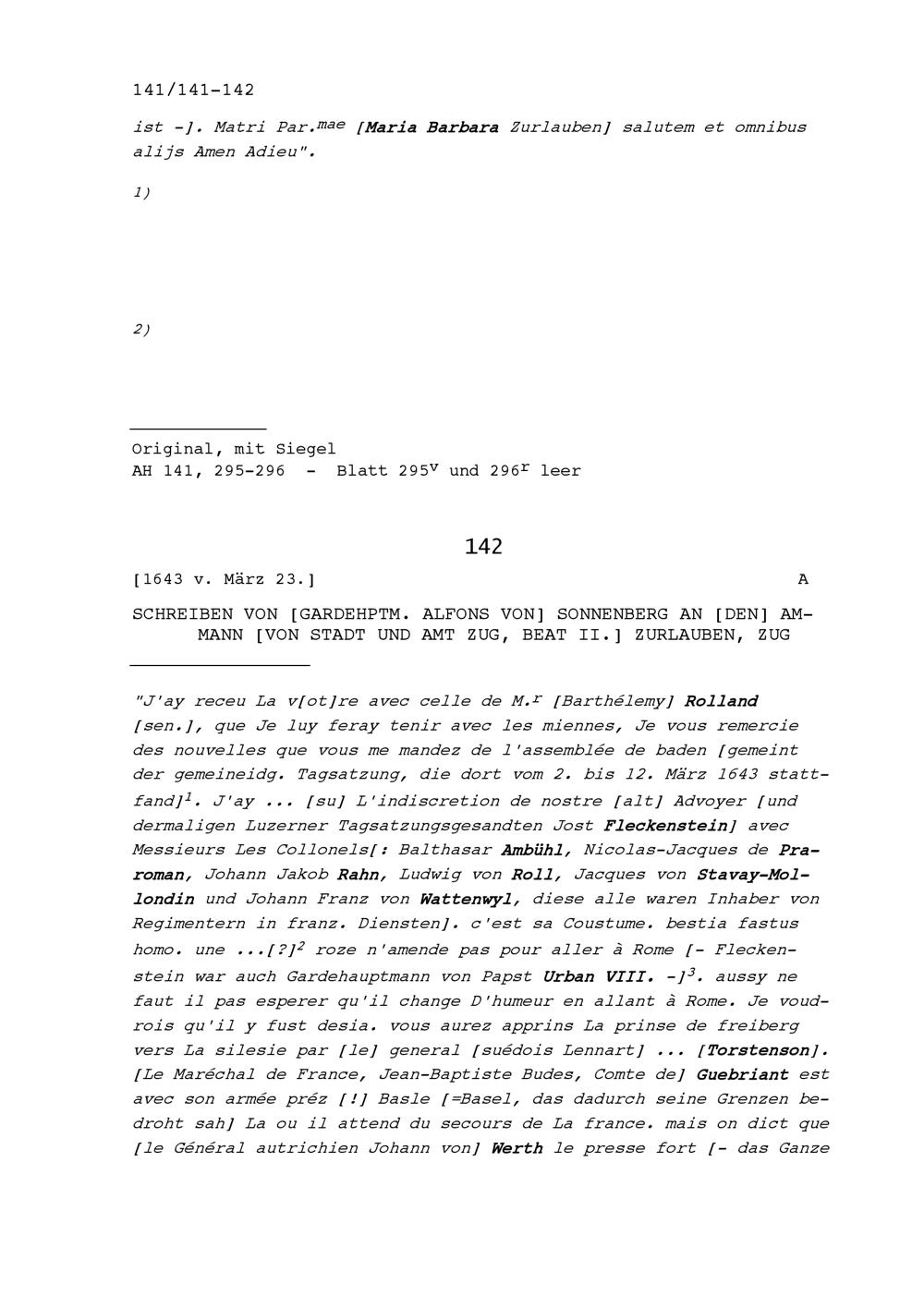 Schreiben von Alfons von Sonnenberg, Gardehauptmann, an Beat II. Zurlauben, Ammann von Stadt und Amt Zug, Zug