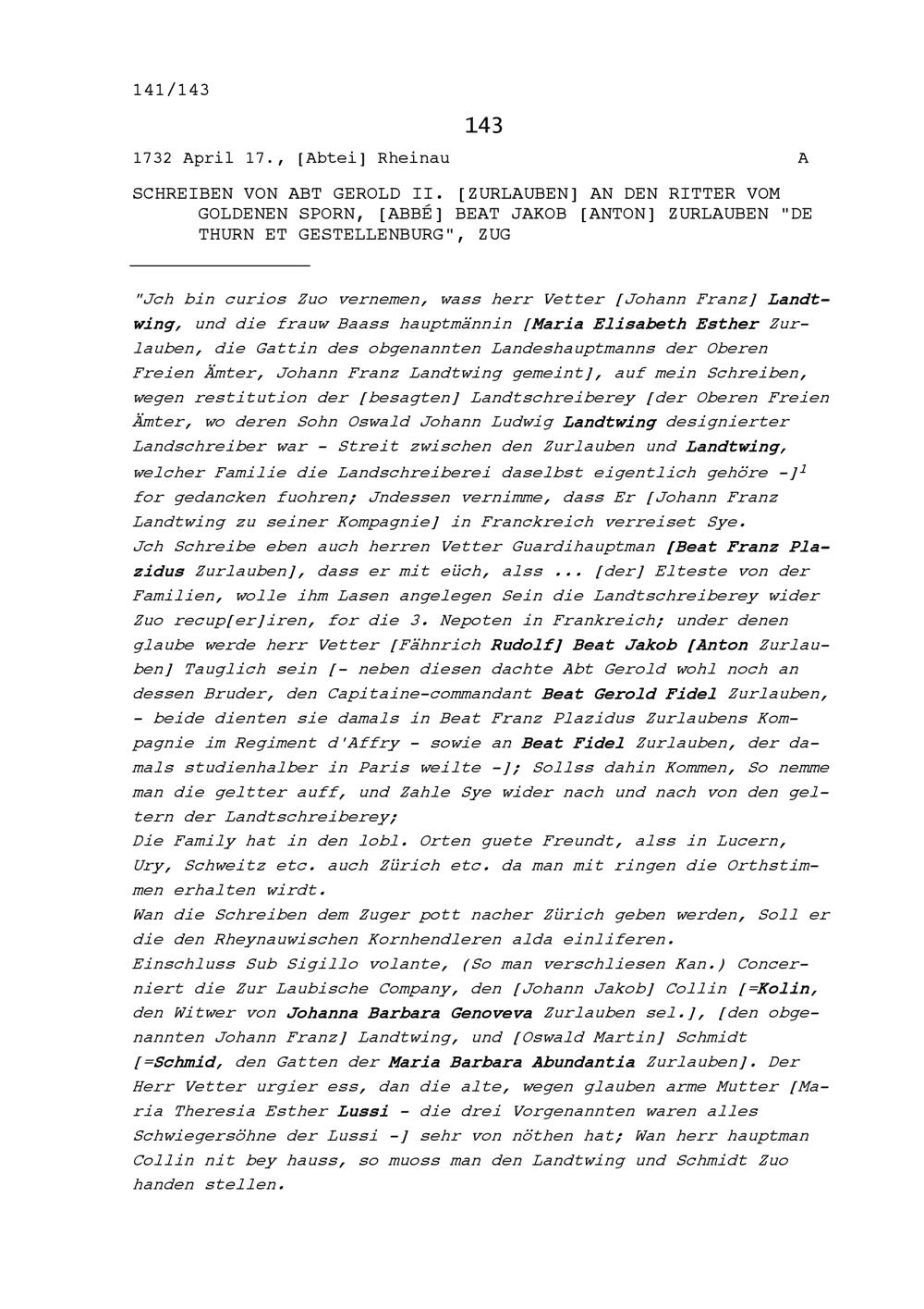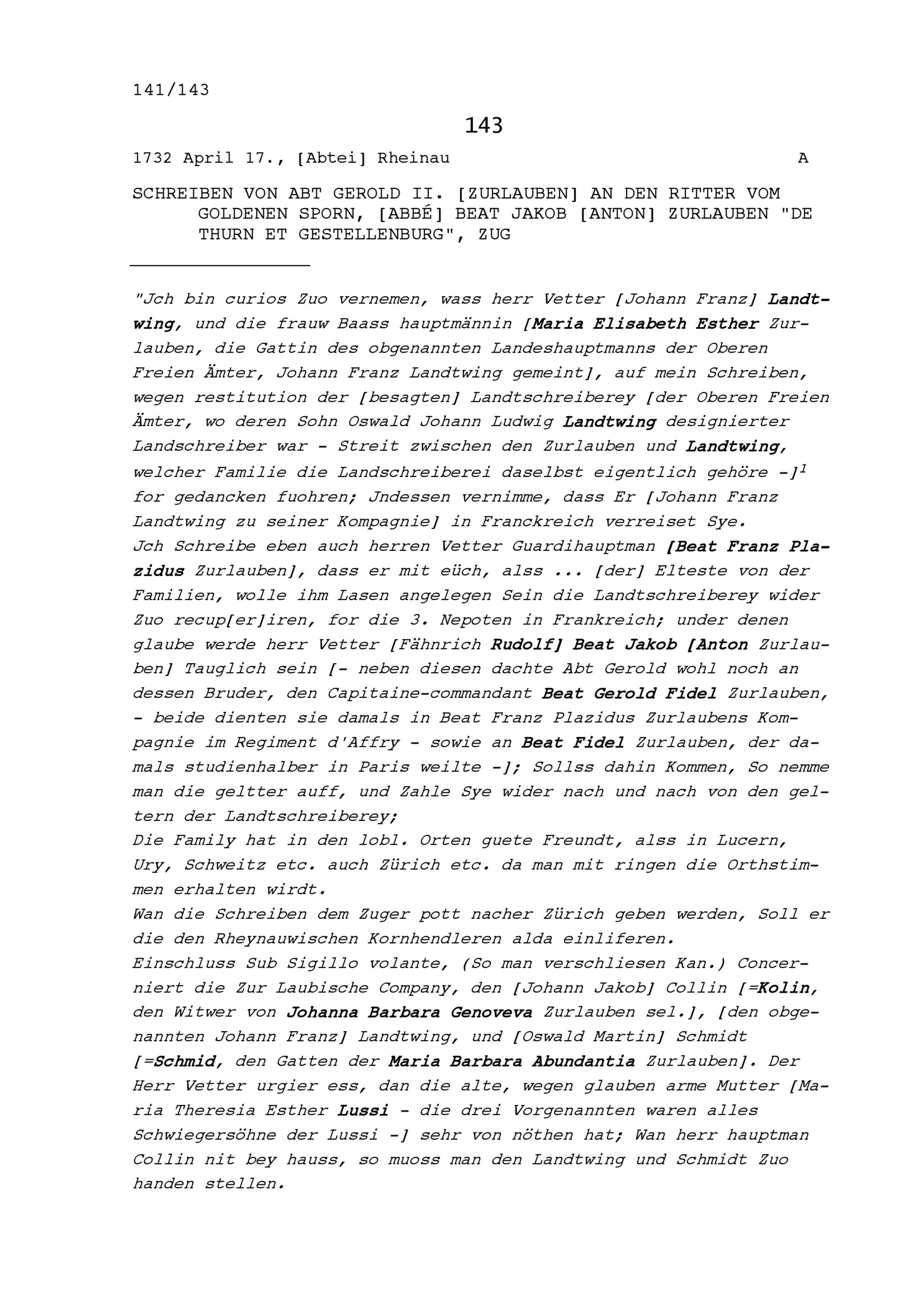 Schreiben von Gerold II. Zurlauben, Abt von Rheinau, an Beat Jakob Anton Zurlauben Priester, Zug