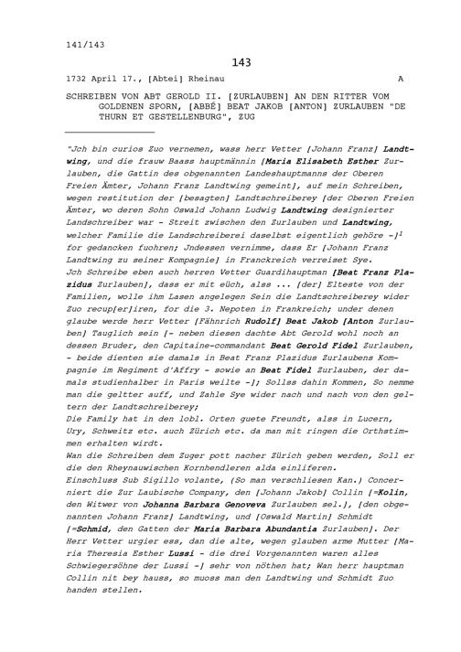 Schreiben von Gerold II. Zurlauben, Abt von Rheinau, an Beat Jakob Anton Zurlauben...