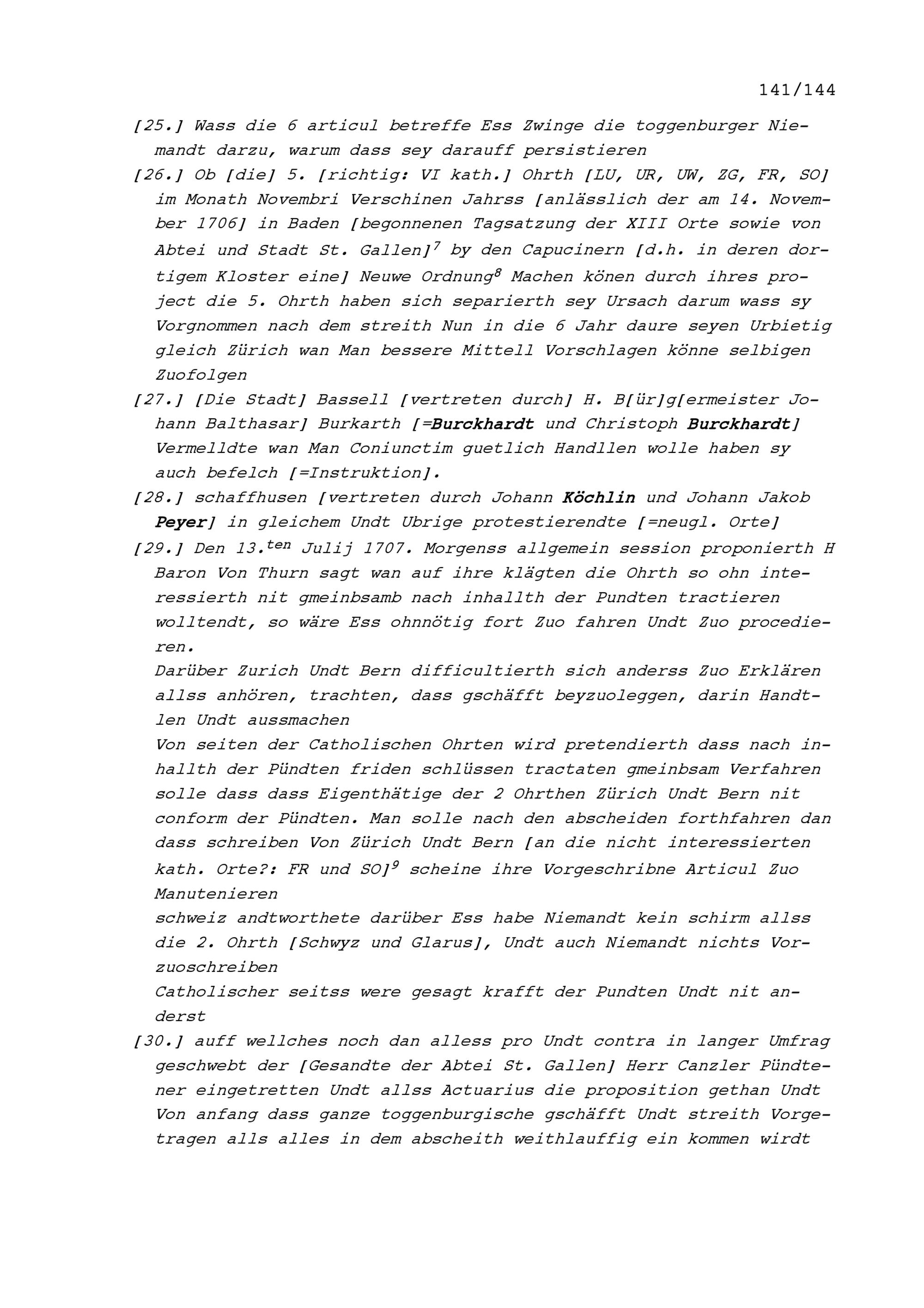 Notiz von Beat Jakob II. Zurlauben, Tagsatzungsgesandter von Stadt und Amt Zug an die am 3. Juli 1707 in Baden begonnene Jahrrechnung