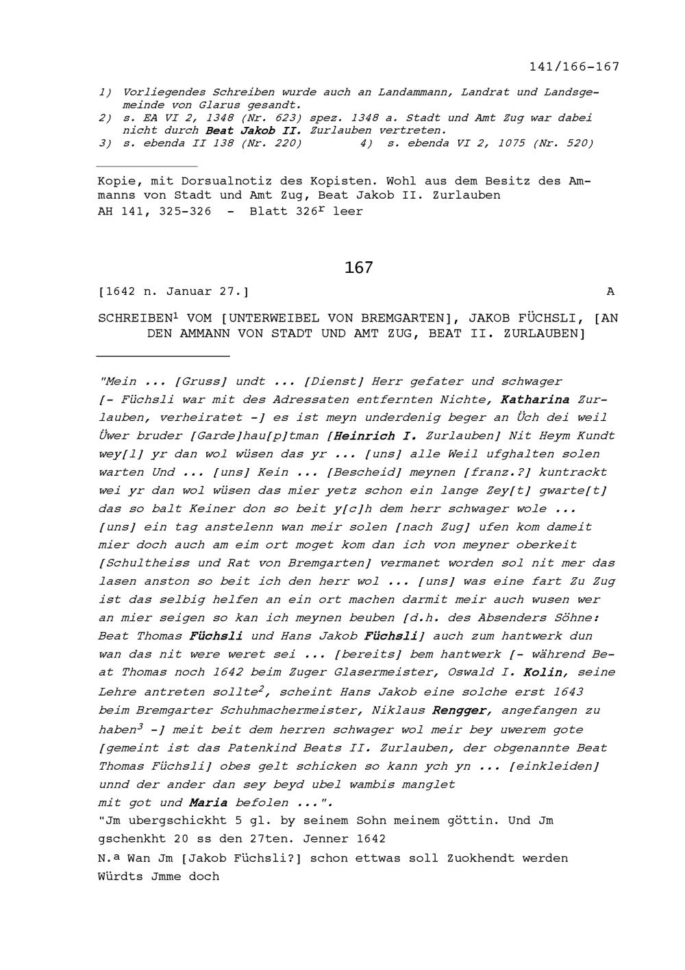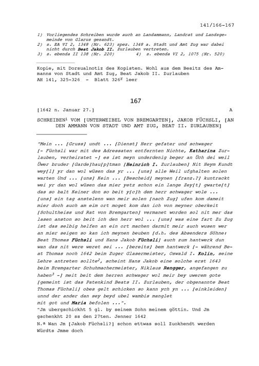 Schreiben von Jakob Füchslin, Unterweibel von Bremgarten, an Beat II. Zurlauben, Ammann