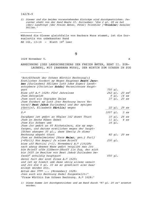 Abrechnung von Beat II. Zurlauben, Landschreiber der Freien Ämter, mit Barbara Muos, Wirtin zum Ochsen in Zug