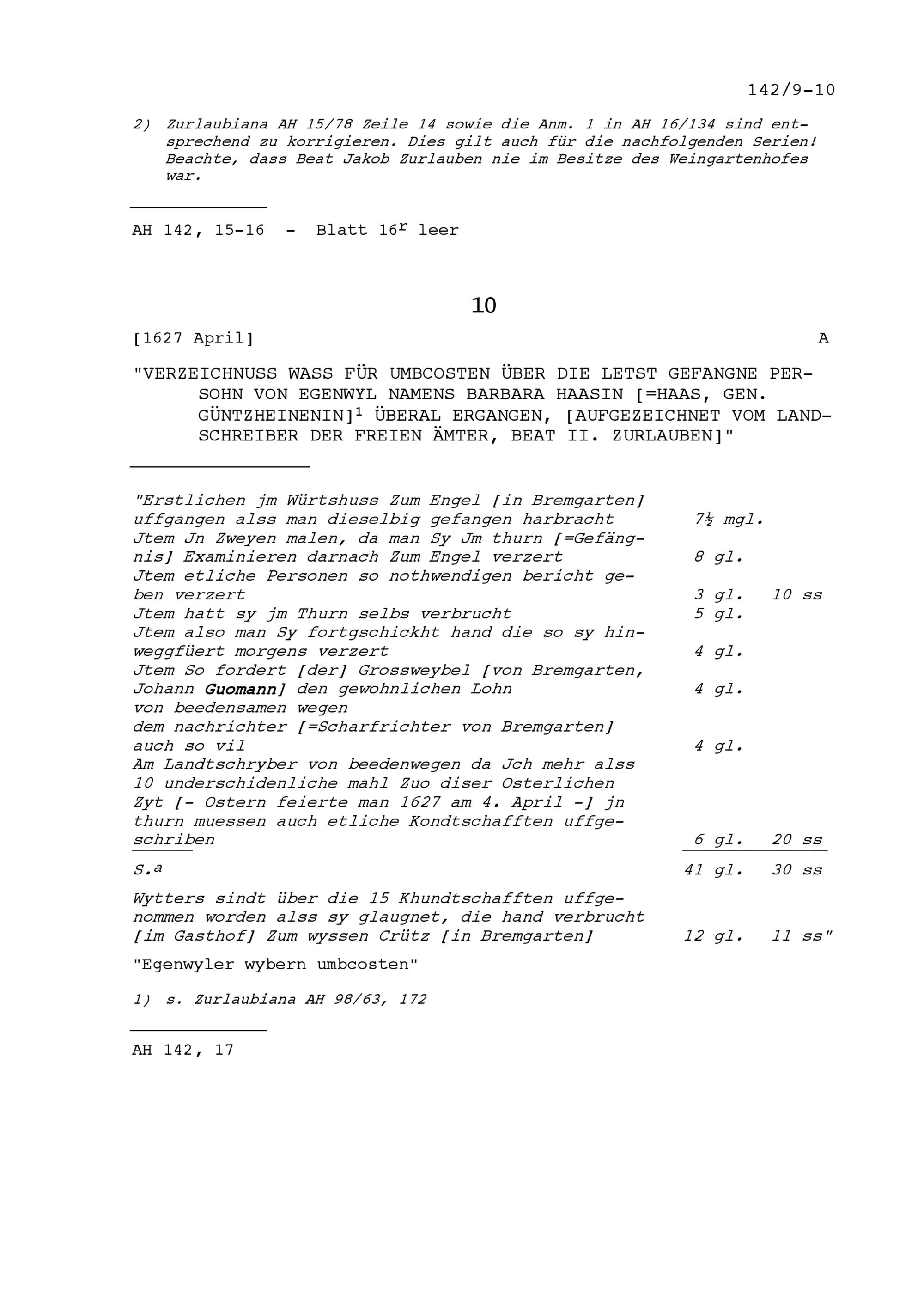 Unkosten wegen Barbara Haas, genannt Güntzheinenin, Gefangene, Egenwil, aufgezeichnet...