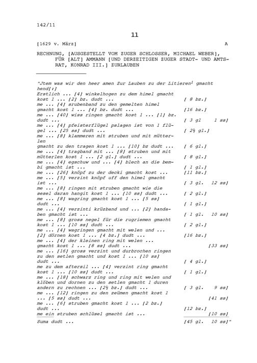 Rechnung für Konrad III. Zurlauben, Altammann und Stadt- und Amtrat Zug, ausgestellt Michael Weber, von Zuger Schlosser