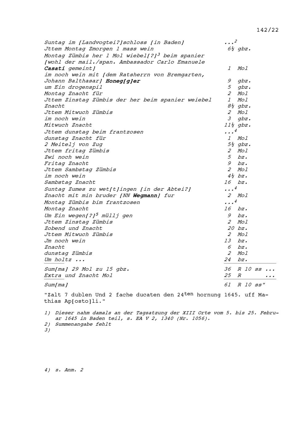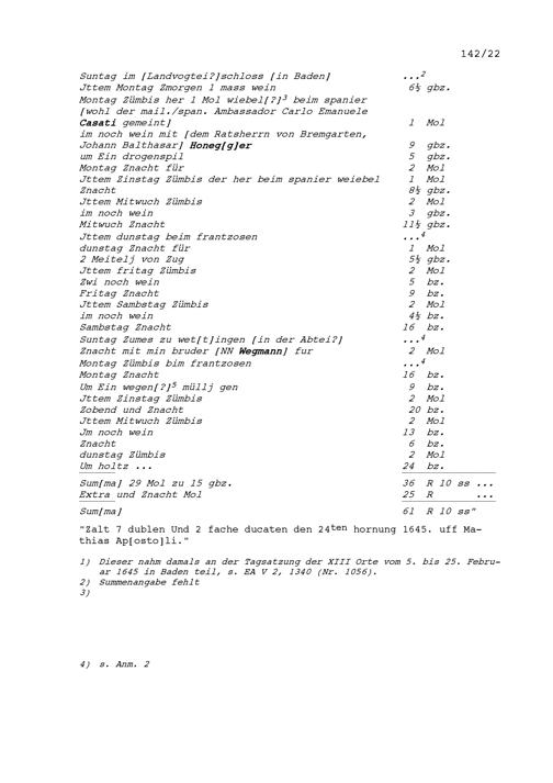 Rechnung für Beat II. Zurlauben, Altammann von Stadt und Amt Zug und Tagsatzungsgesandter, ausgestellt Bernhard Wegmann, von Gastwirt zum Engel in Baden