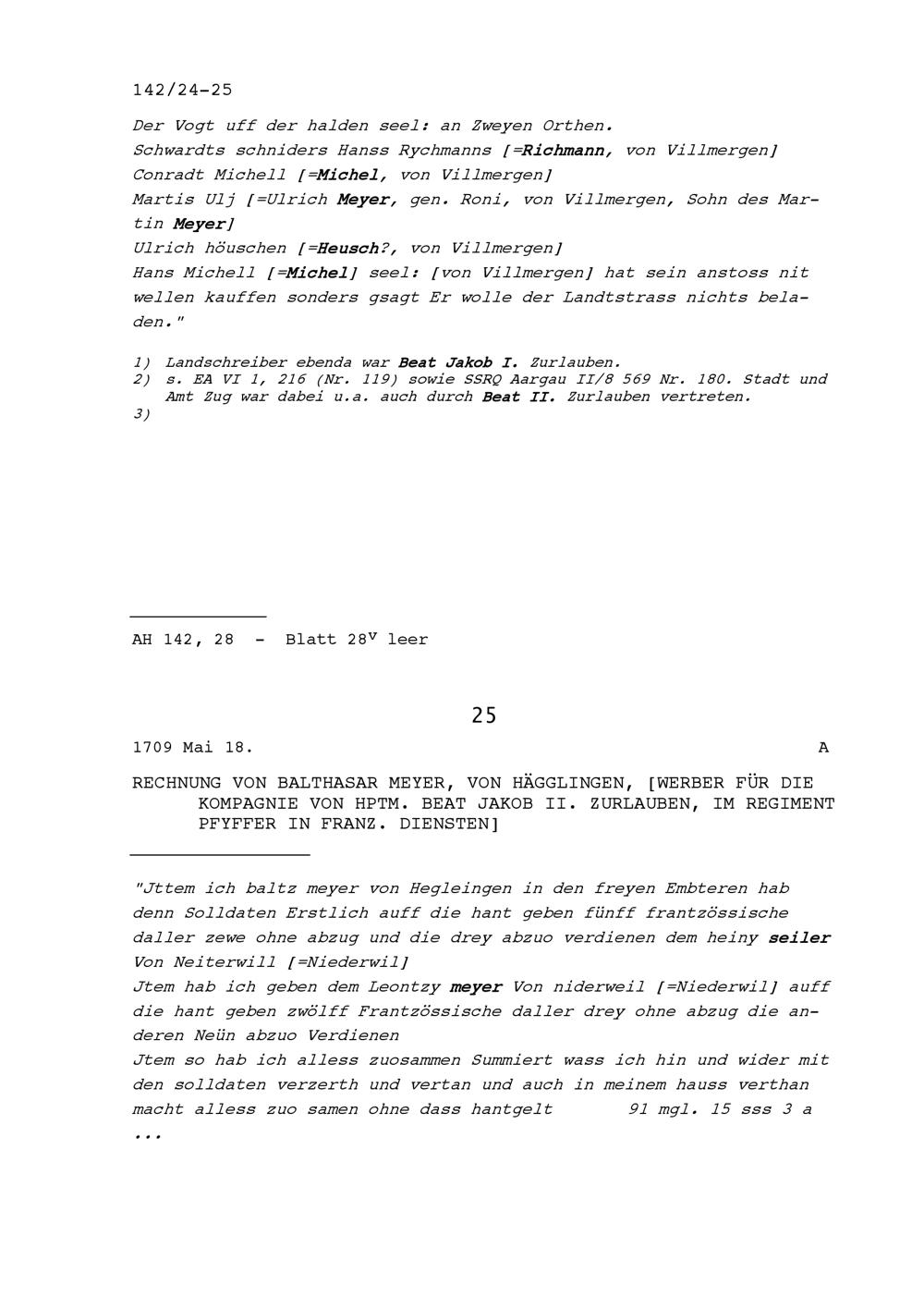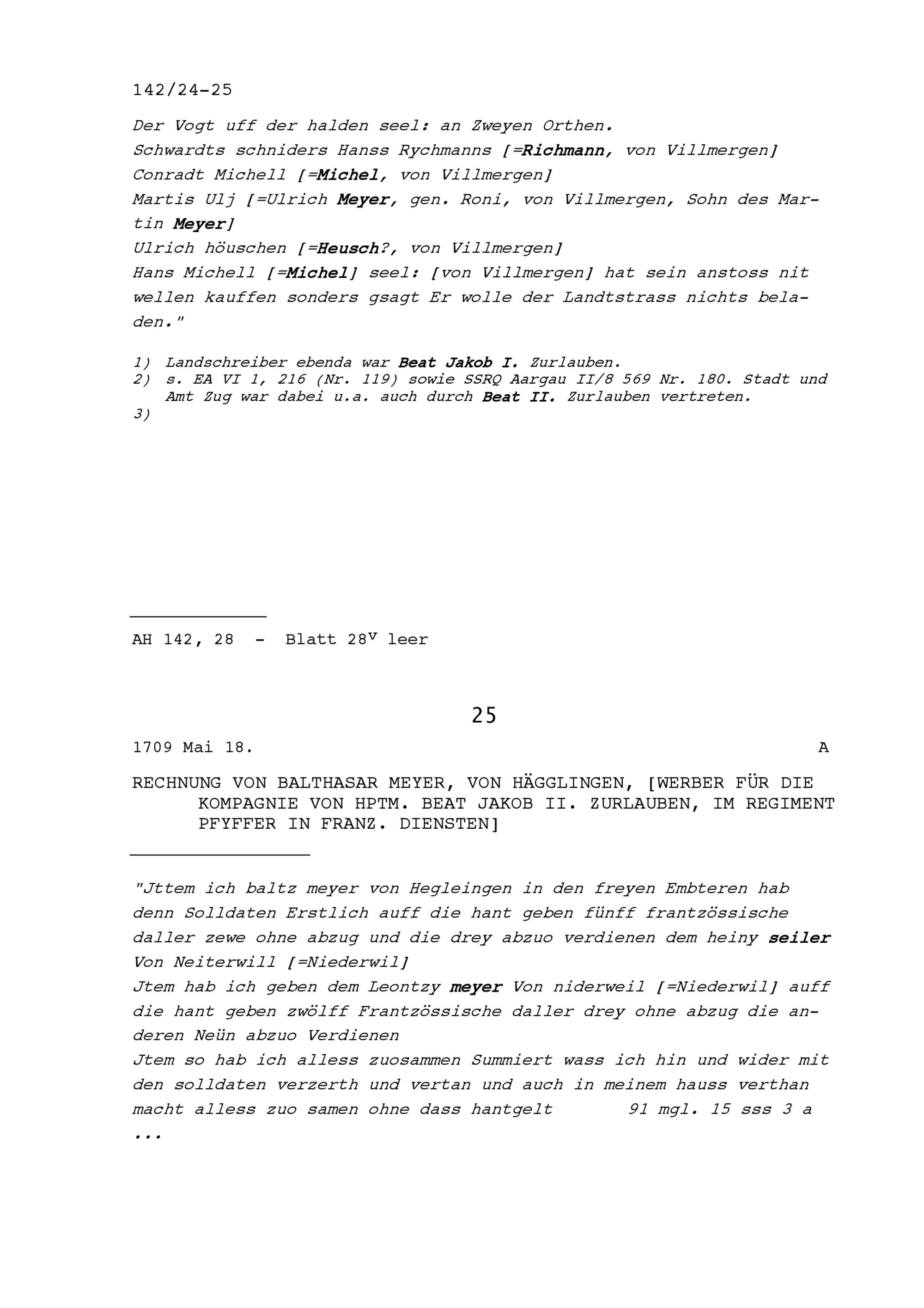 Rechnung von Balthasar Meyer, von Hägglingen, Werber für die Kompanie von Beat Jakob...
