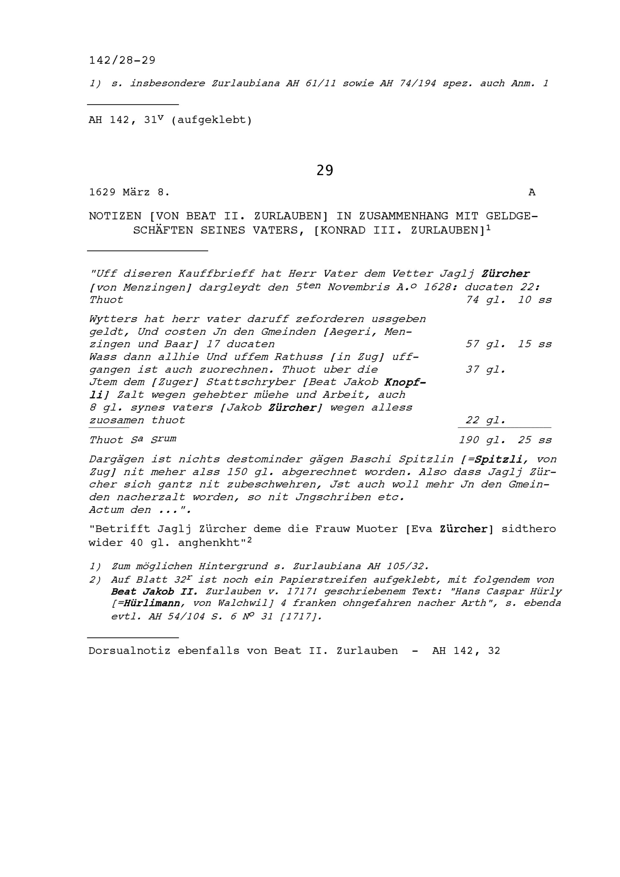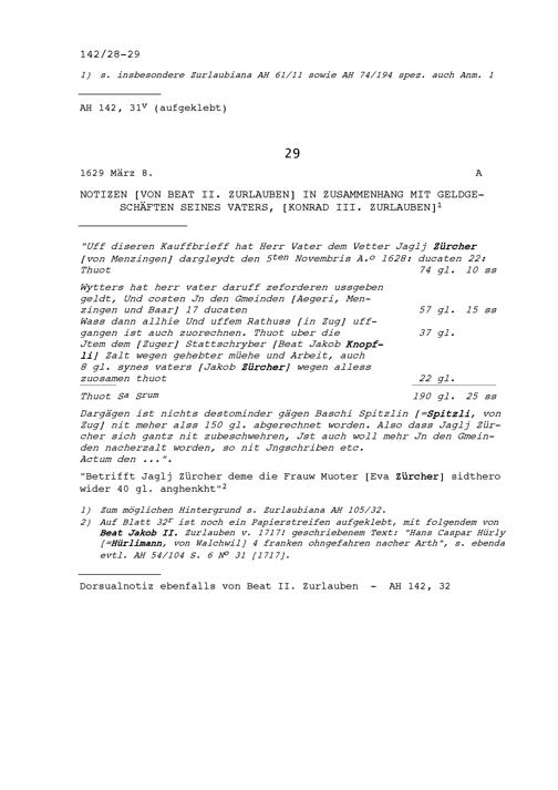 Notiz von Beat II. Zurlauben in Zusammenhang mit Geldgeschäften von Konrad III. Zurlauben, seinem Vater