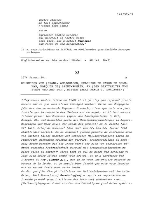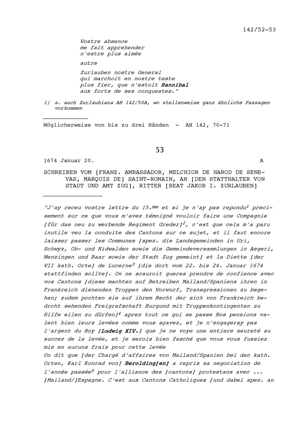 Schreiben von Melchior de Harod de Senevas, Marquis de Saint-Romain, Ambassador von Frankreich, an Beat Jakob I. Zurlauben, Statthalter von Stadt und Amt Zug
