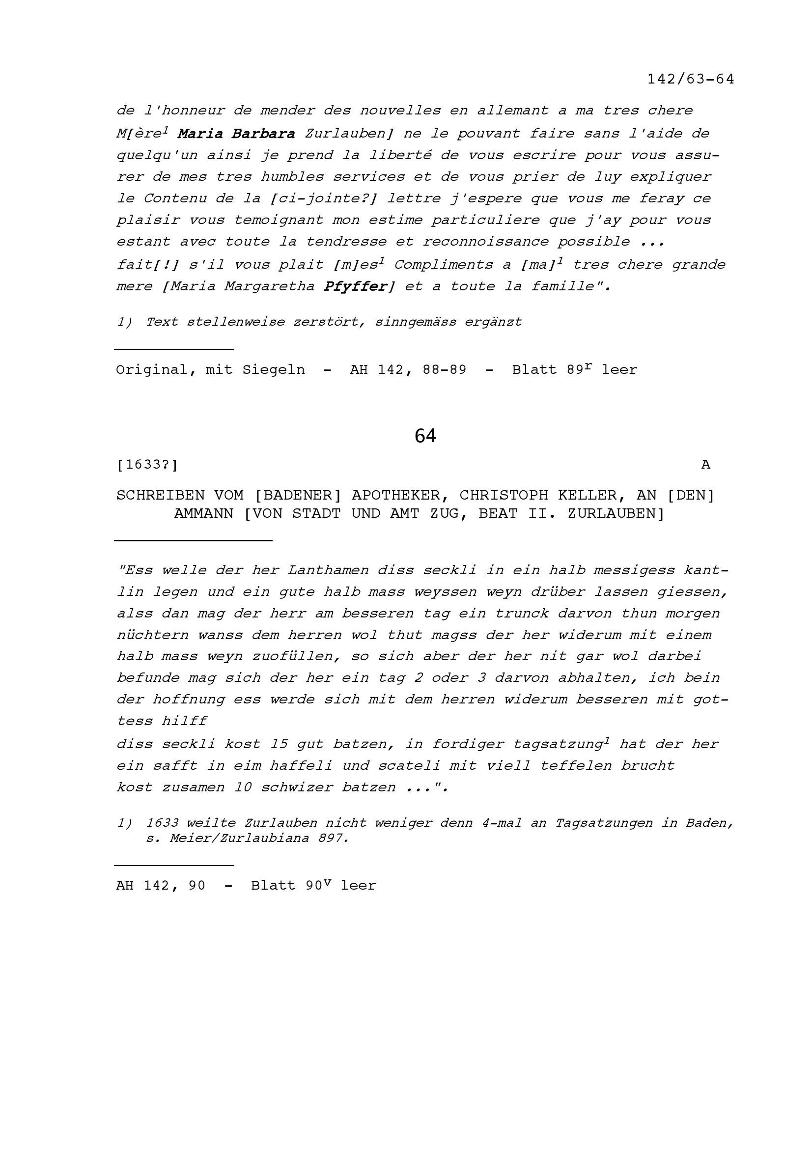 Schreiben von Christoph Keller, Badener Apotheker, an Beat II. Zurlauben, Ammann...