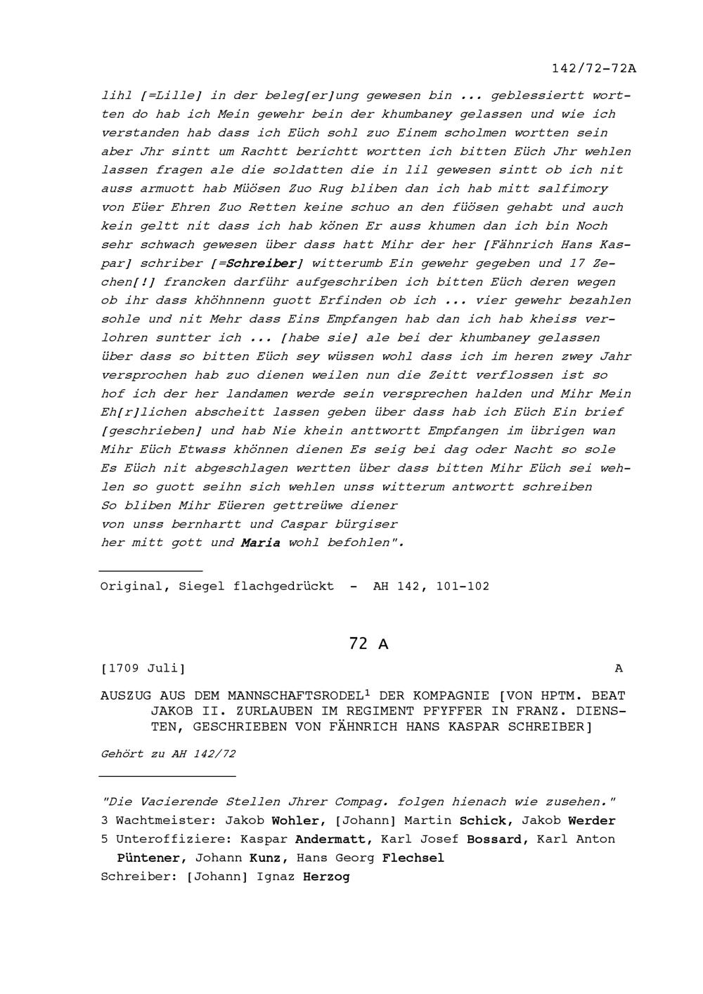 Mannschaftsrodel der Kompanie von Beat Jakob II. Zurlauben, Hauptmann im Regiment Pfyffer in französischen Diensten, geschrieben von Hans Kaspar Schreiber, Fähnrich