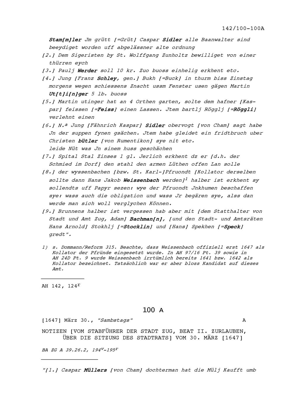 Notiz von Beat II. Zurlauben, Stabführer der Stadt Zug, über die Sitzung des Stadtrats vom 30. März 1647