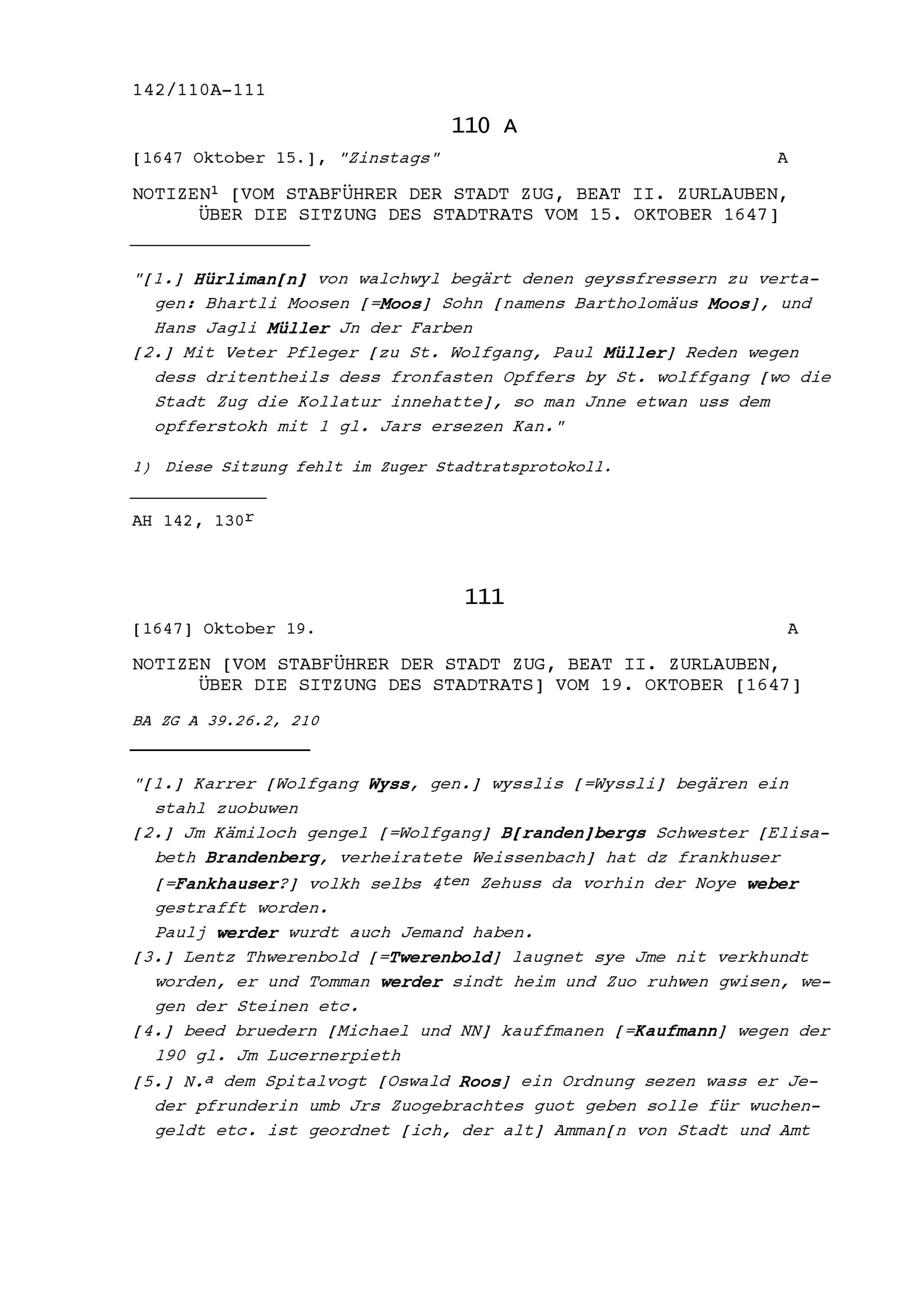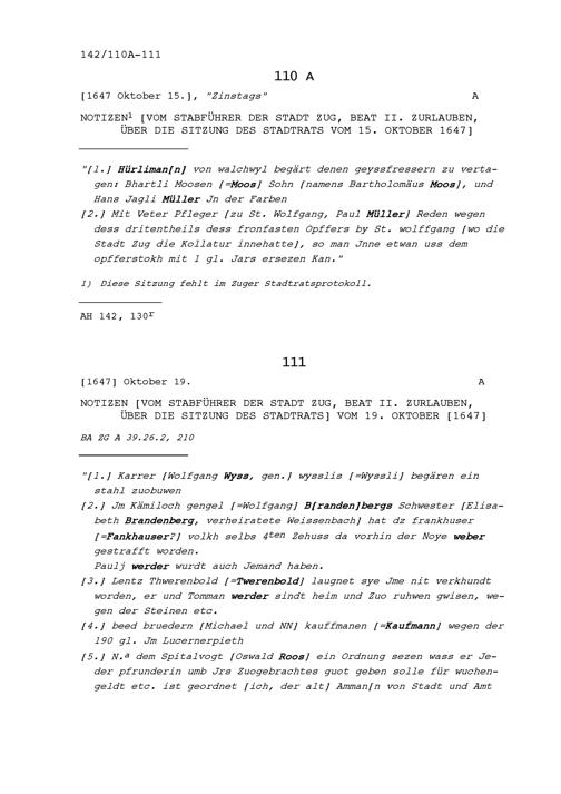 Notiz von Beat II. Zurlauben, Stabführer der Stadt Zug, über die Sitzung des Stadtrats vom 15. Oktober 1647