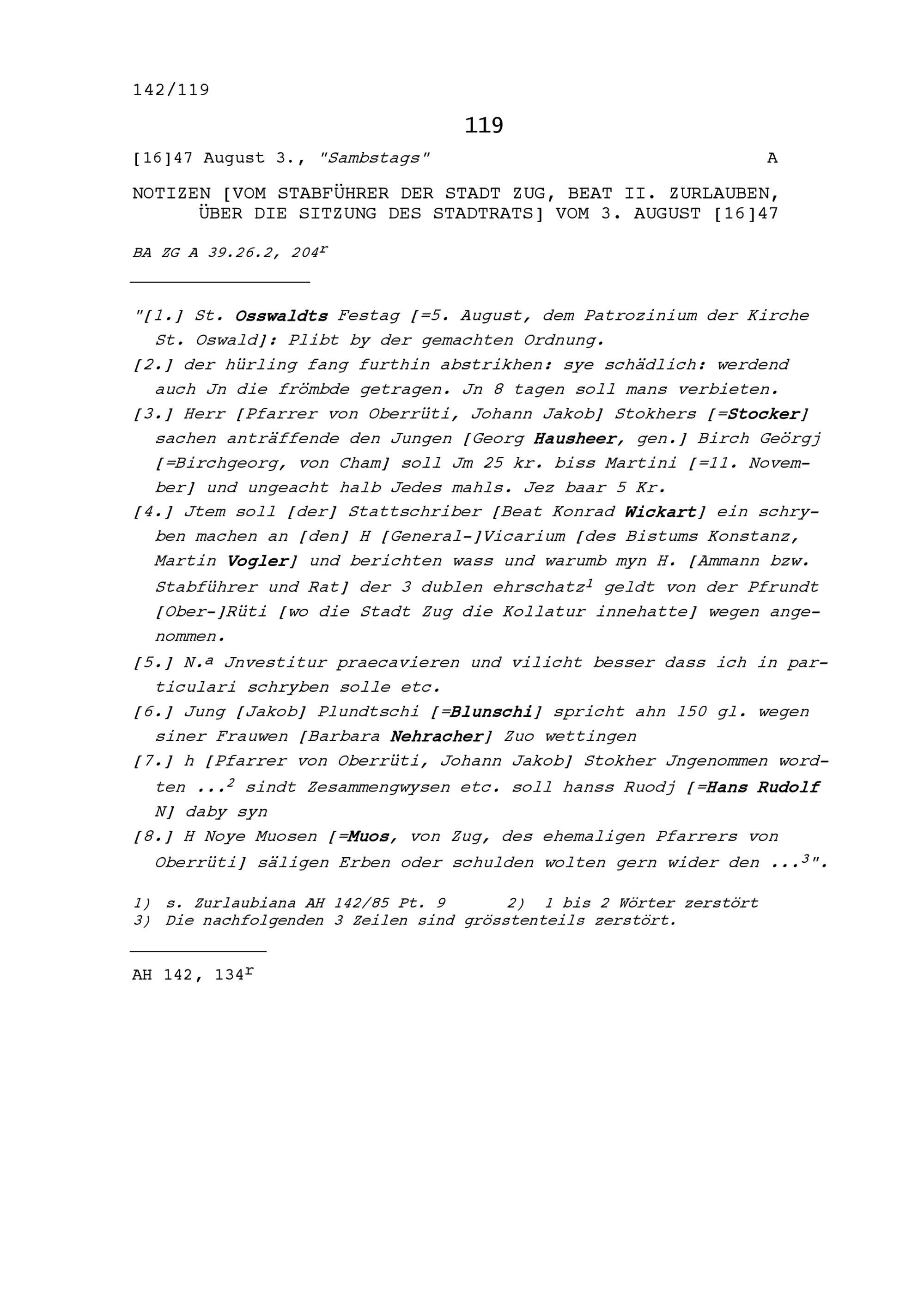 Notiz von Beat II. Zurlauben, Stabführer der Stadt Zug, über die Sitzung des Stadtrats vom 3. August 1647