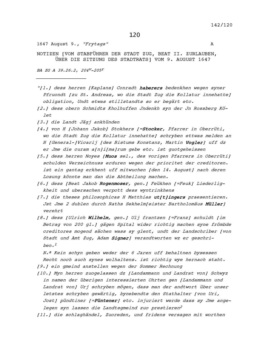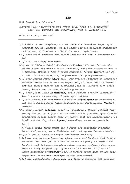 Notiz von Beat II. Zurlauben, Stabführer der Stadt Zug, über die Sitzung des Stadtrats vom 9. August 1647