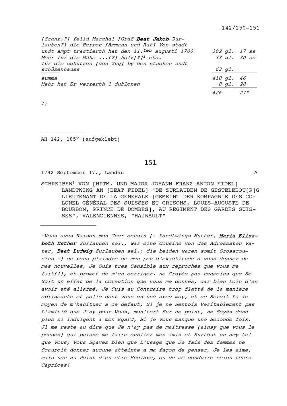 Schreiben von Johann Franz Anton Fidel Landtwing, Hauptmann und Major, an Beat Fidel Zurlauben, Generalleutnant der Kompanie von Louis-Auguste de Bourbon, Prince de Dombes, Generaloberst der Schweizer und Bündner, Valenciennes