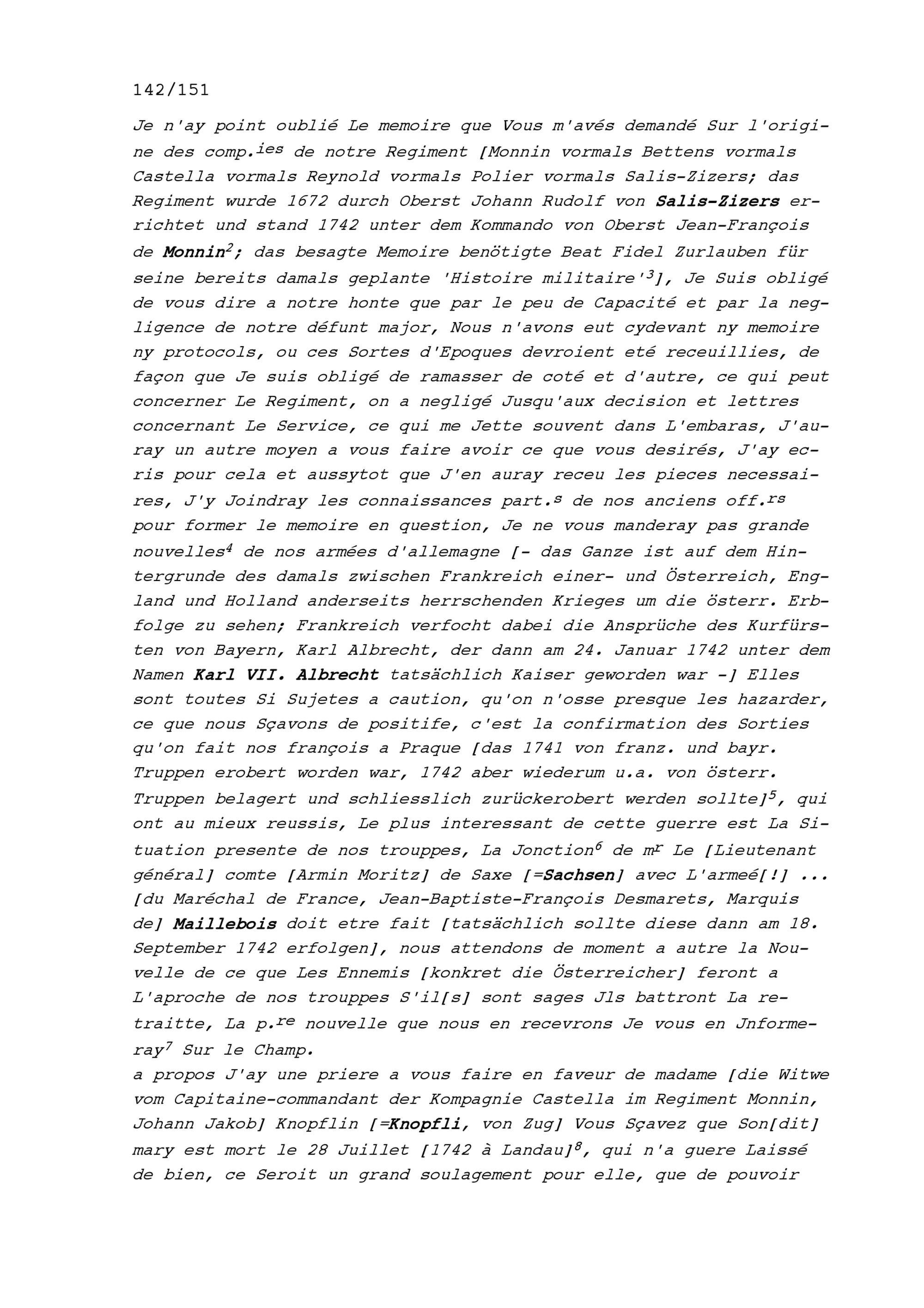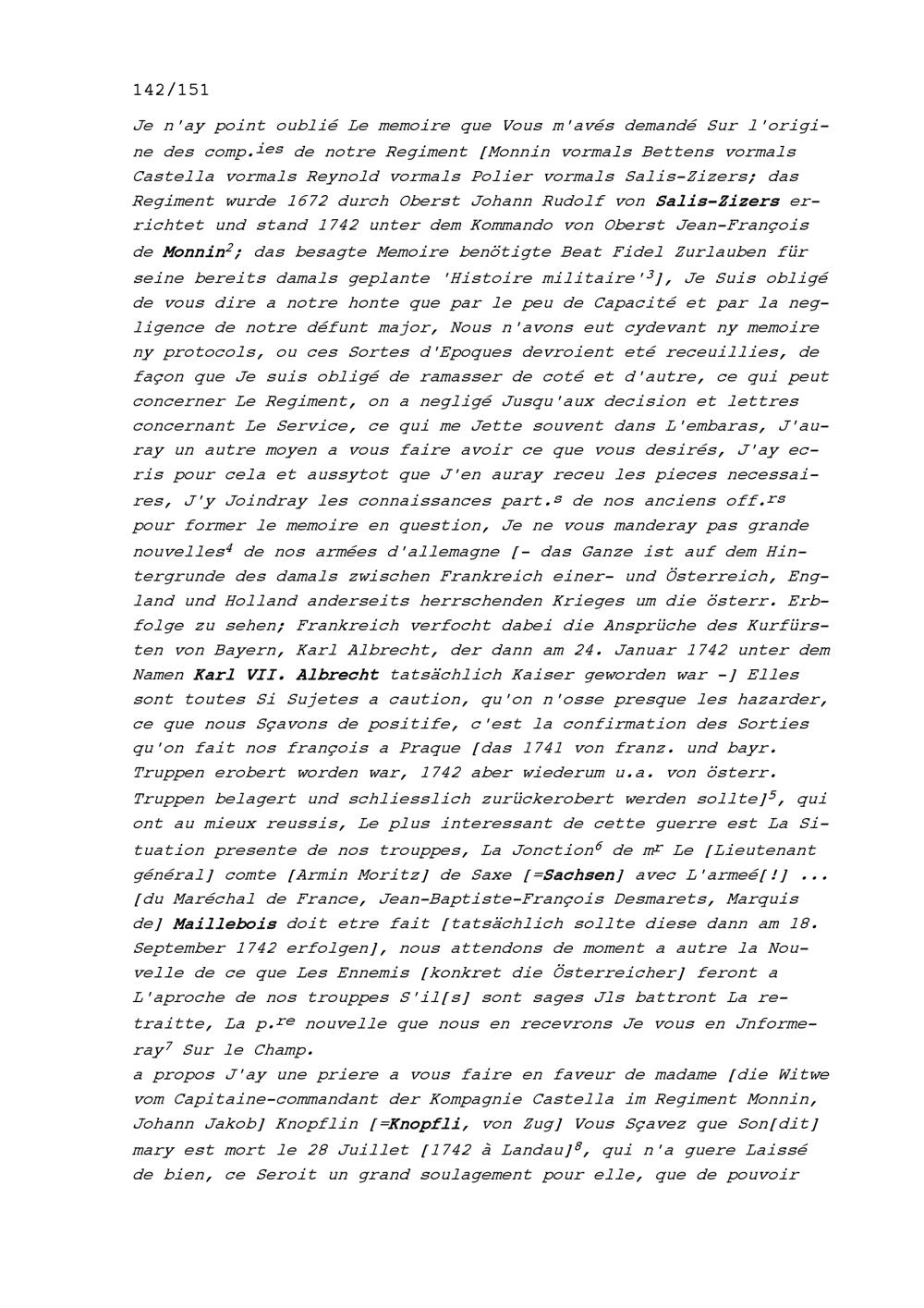 Schreiben von Johann Franz Anton Fidel Landtwing, Hauptmann und Major, an Beat Fidel Zurlauben, Generalleutnant der Kompanie von Louis-Auguste de Bourbon, Prince de Dombes, Generaloberst der Schweizer und Bündner, Valenciennes