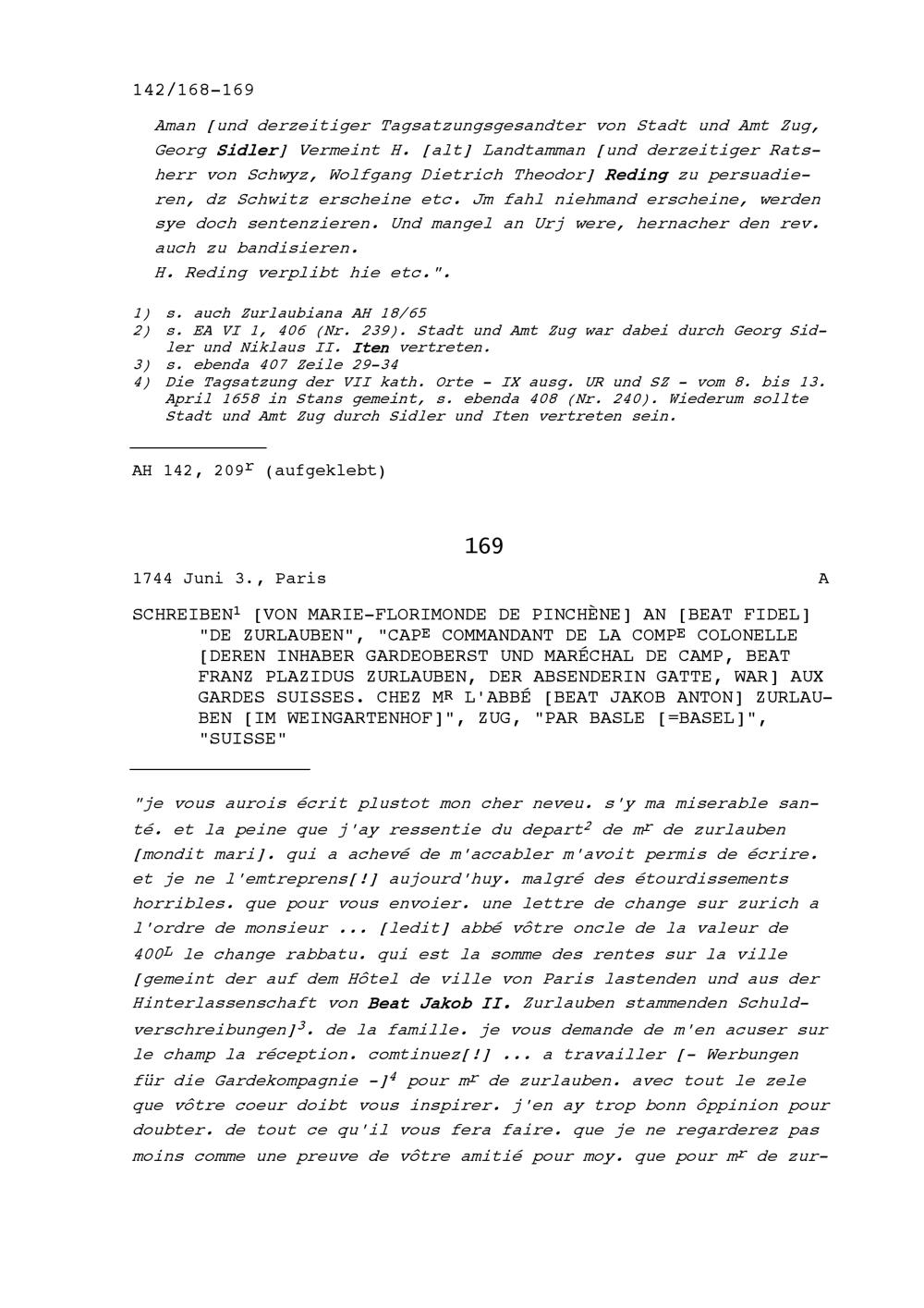 Schreiben von Marie-Florimonde de Pinchène an Beat Fidel Zurlauben, Hauptmann einer Kompanie unter Beat Franz Plazidus Zurlauben, Gardeoberst und Feldmarschall, Gatte, der Absenderin, Zug
