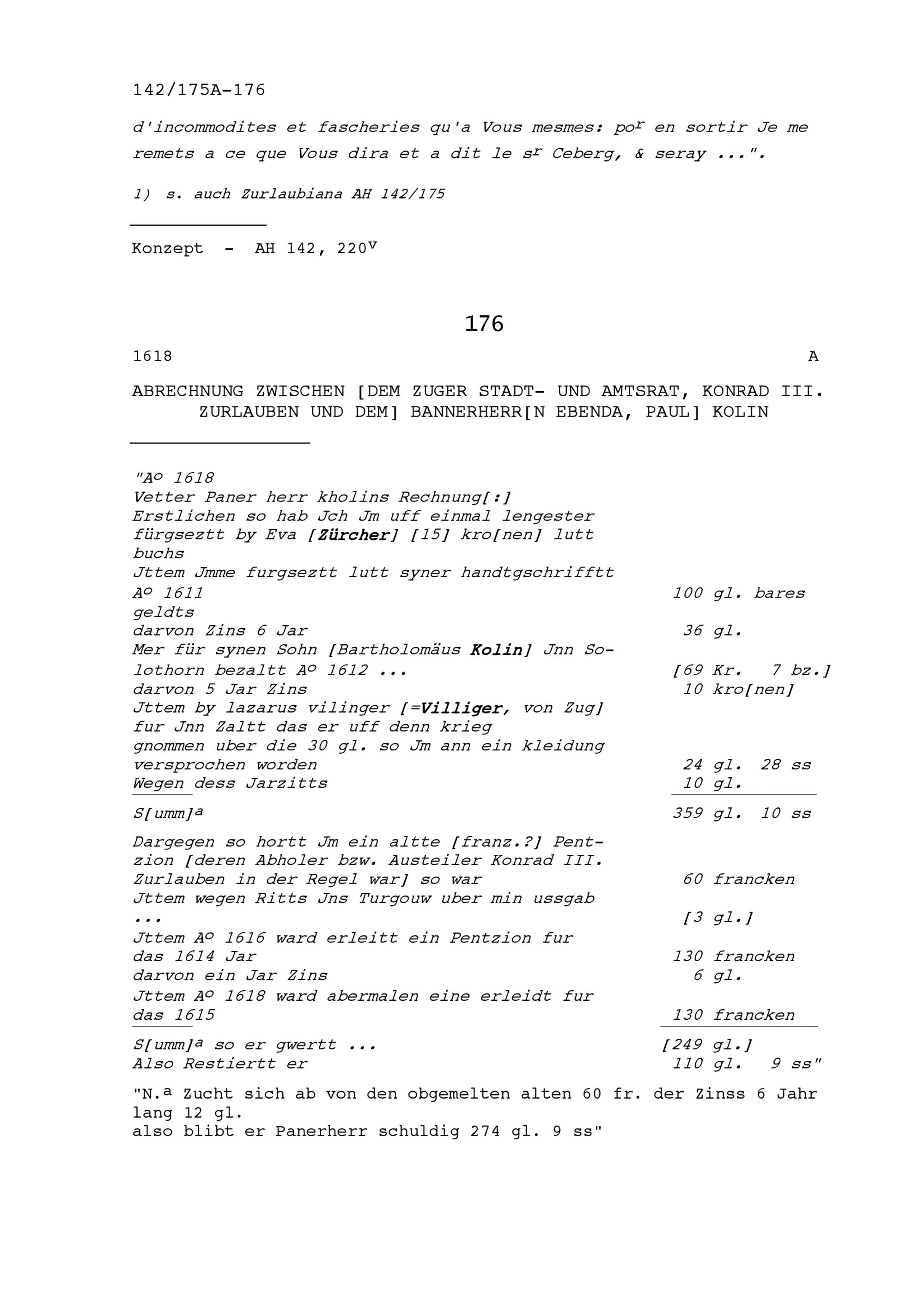 Abrechnung zwischen Konrad III. Zurlauben, Stadt- und Amtrat Zug, und Paul Kolin, Bannerherr