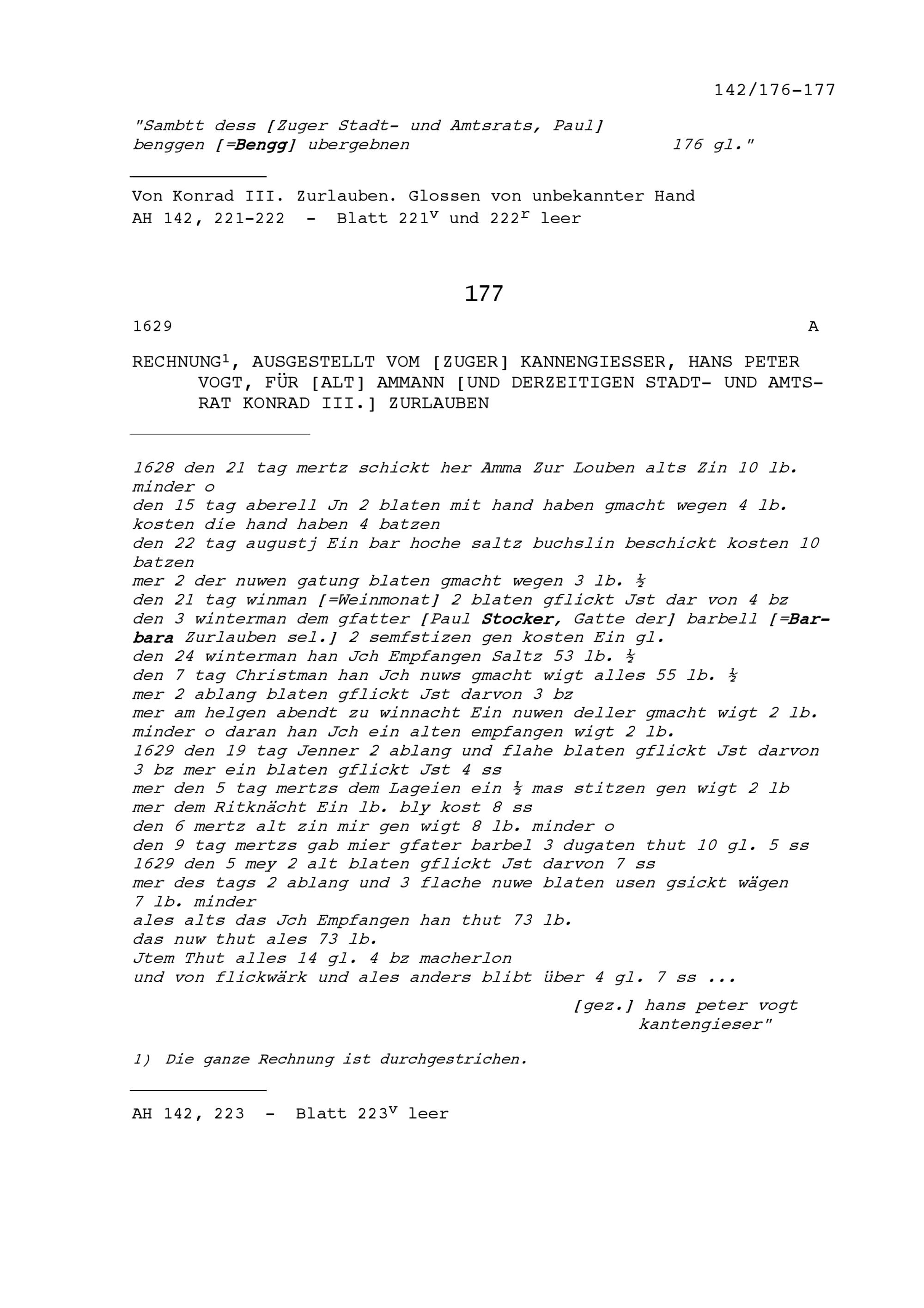 Rechnung für Konrad III. Zurlauben, Altammann und Stadt- und Amtrat, ausgestellt von Hans Peter Vogt, Zuger Kannengiesser
