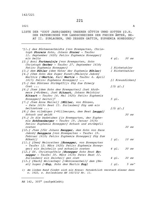 Gaben als Taufgötti und Taufgotte von Beat II. Zurlauben, Landschreiber der Freien...