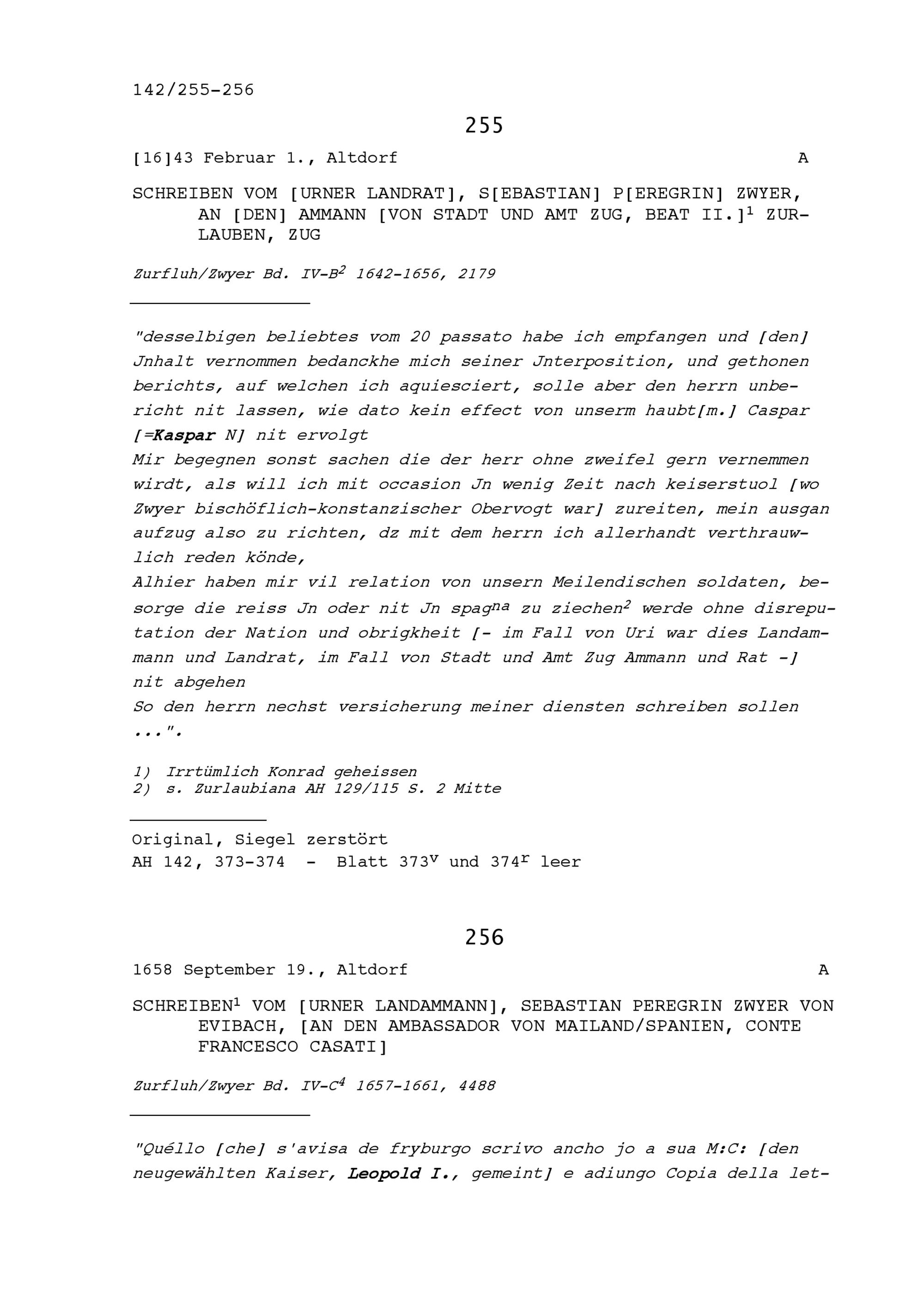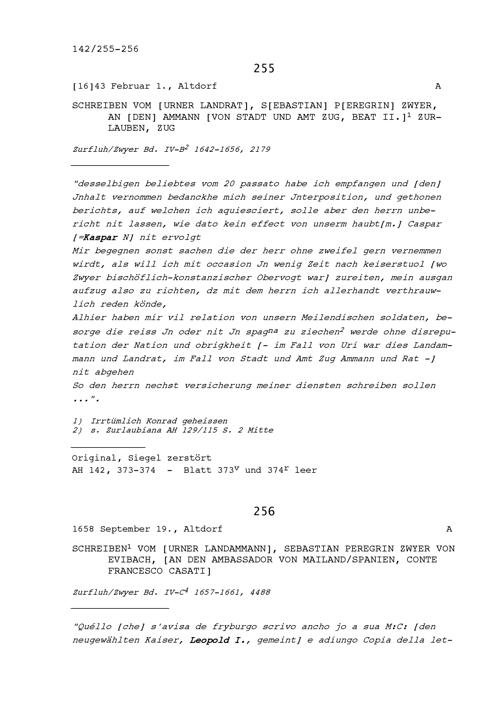 Schreiben von Sebastian Peregrin Zwyer, Landrat Uri, an Beat II. Zurlauben, Ammann...