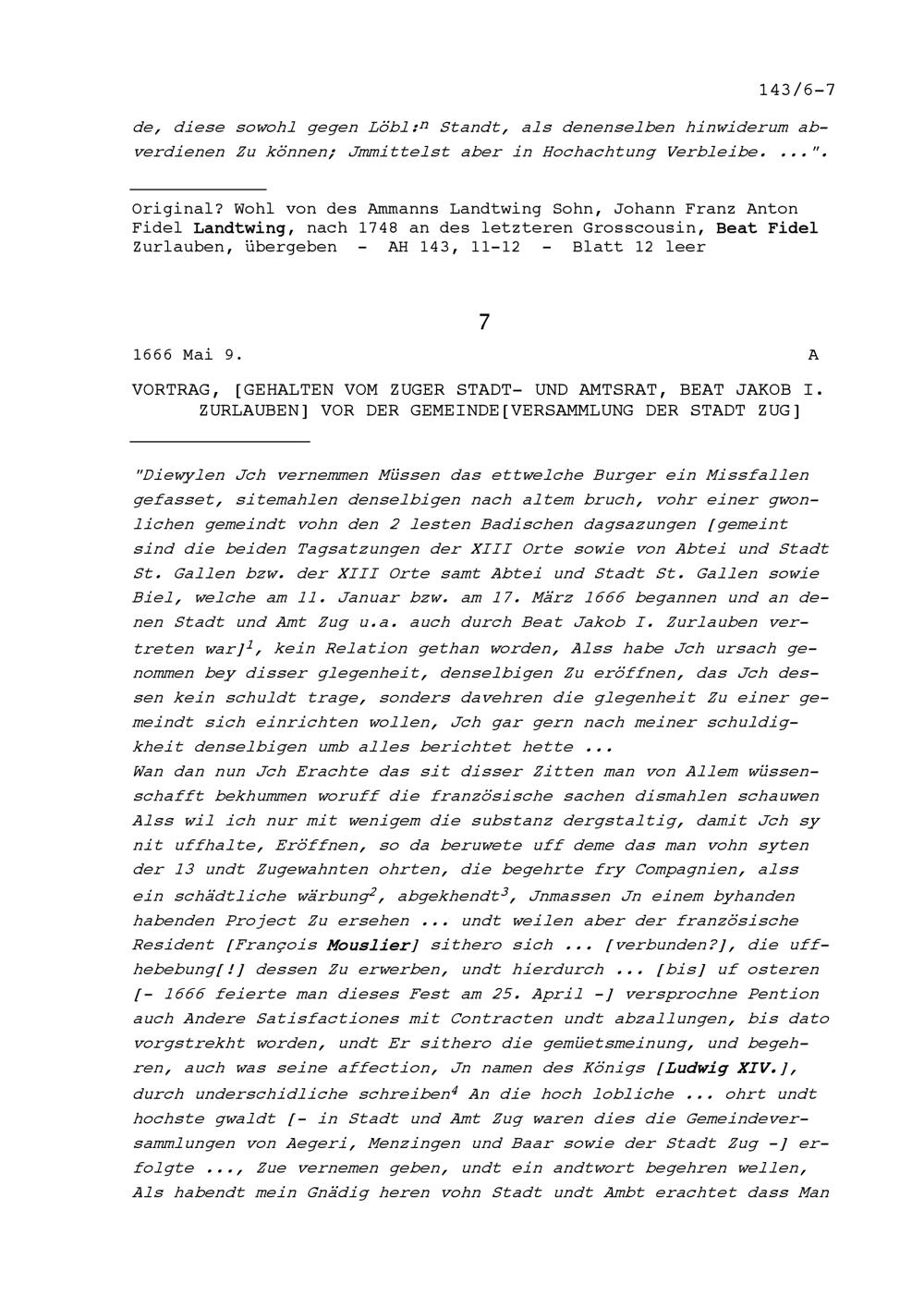 Vortrag von Beat Jakob I. Zurlauben, Stadt- und Amtrat Zug, vor der Gemeindeversammlung...