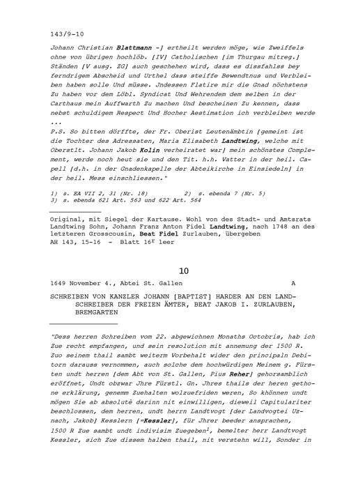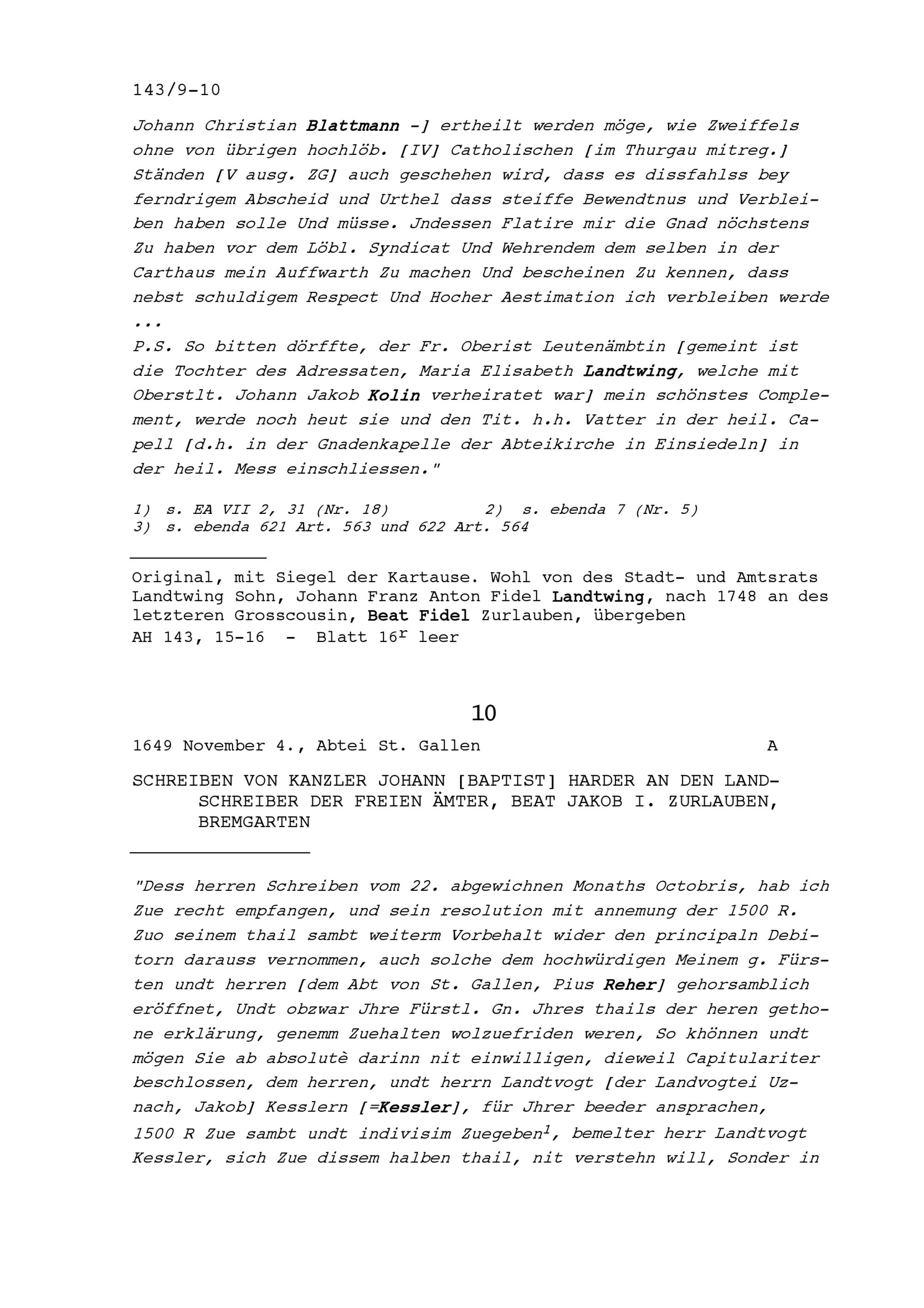 Schreiben von Johann Baptist Harder, Kanzler, an Beat Jakob I. Zurlauben, Landschreiber der Freien Ämter, Bremgarten