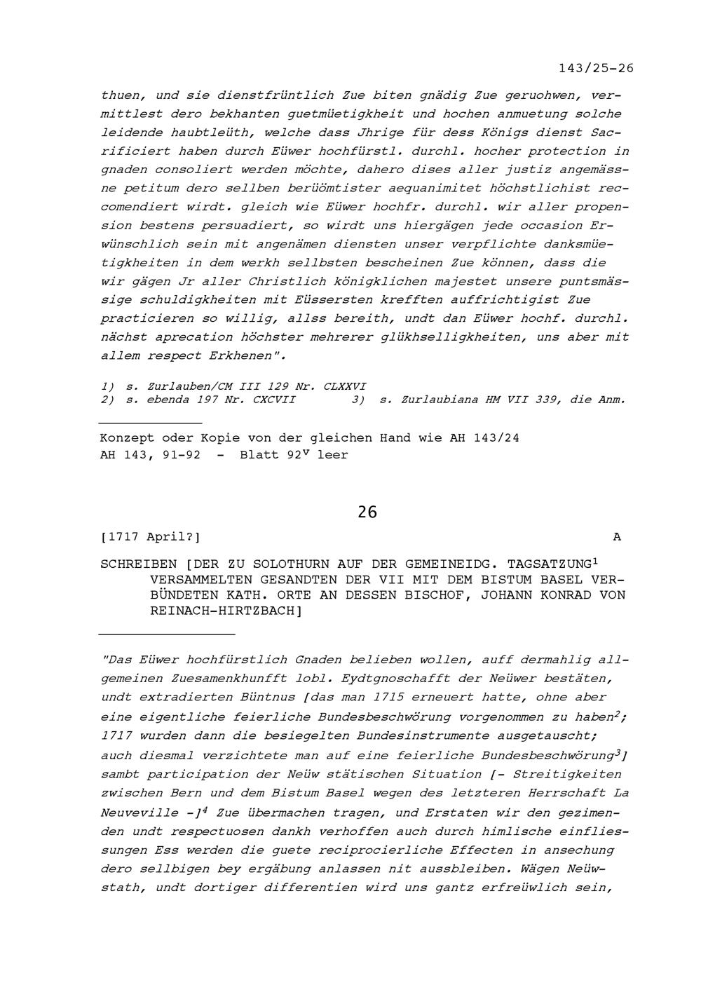 Schreiben der Tagsatzungsgesandten der Sieben mit dem Bistum Basel verbündeten Katholischen Orte in Solothurn an Johann Konrad von Reinach-Hirtzbach, Bischof