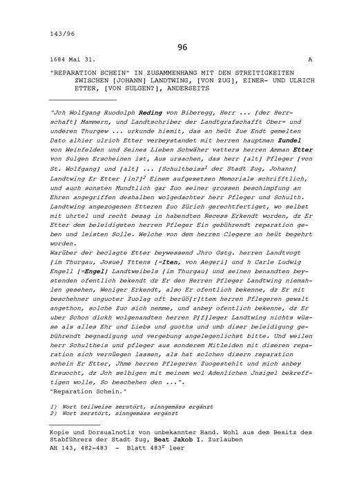 Wiedergutmachungsschein in Zusammenhang mit den Streitigkeiten zwischen Johann Landtwing, von Zug, einerseits und Ulrich Etter, von Sulgen, anderseits