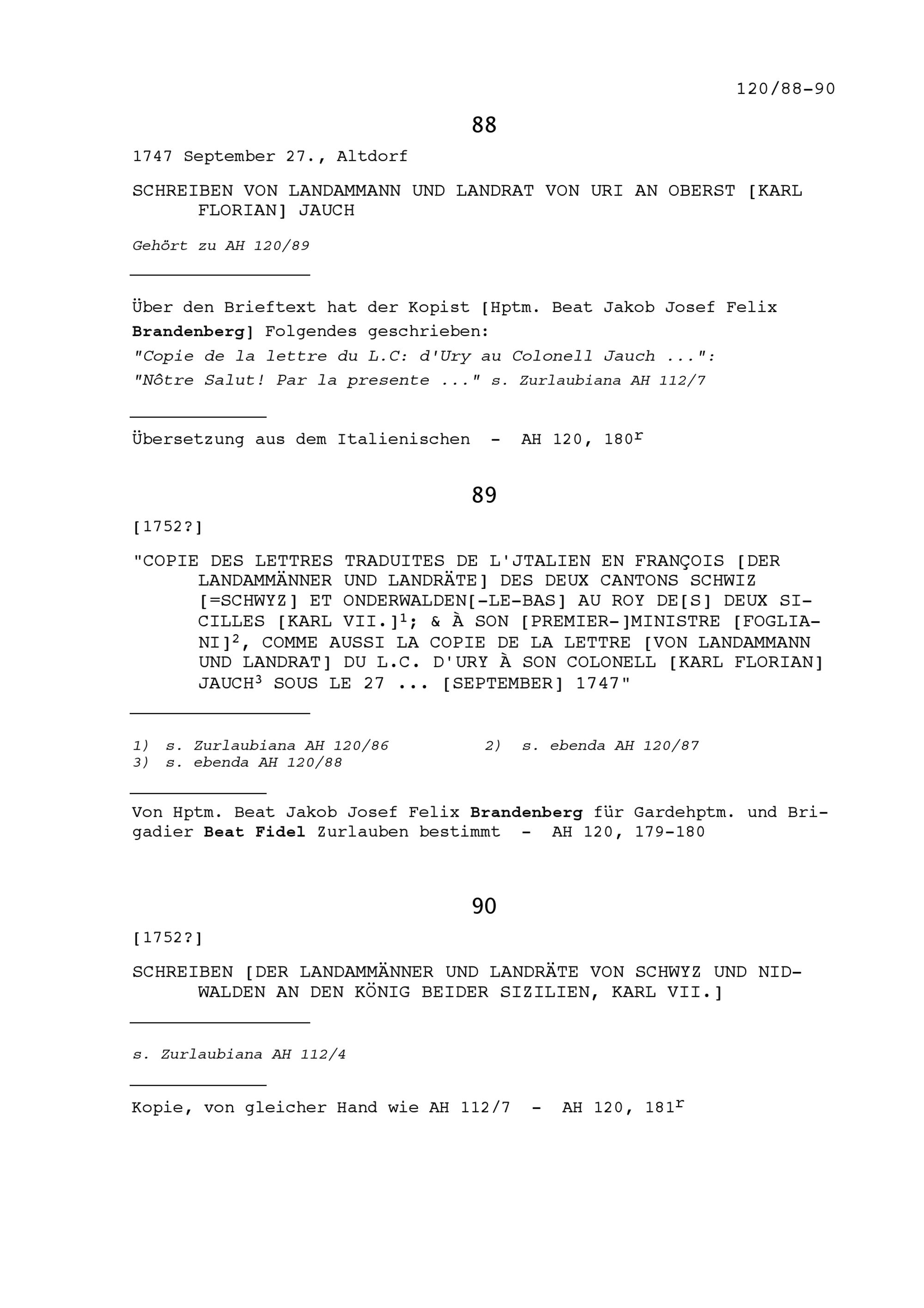 Schreiben von italienischer in die französische Sprache übersetzt der Landammänner und Landräte der Zwei Orte Schwyz und Nidwalden an Karl VII., König beider Sizilien und an NN Fogliani, Premierminister, sowie eines Schreibens von Landammann und Landrat Uri an Karl Florian Jauch, Oberst, vom 27. September 1747