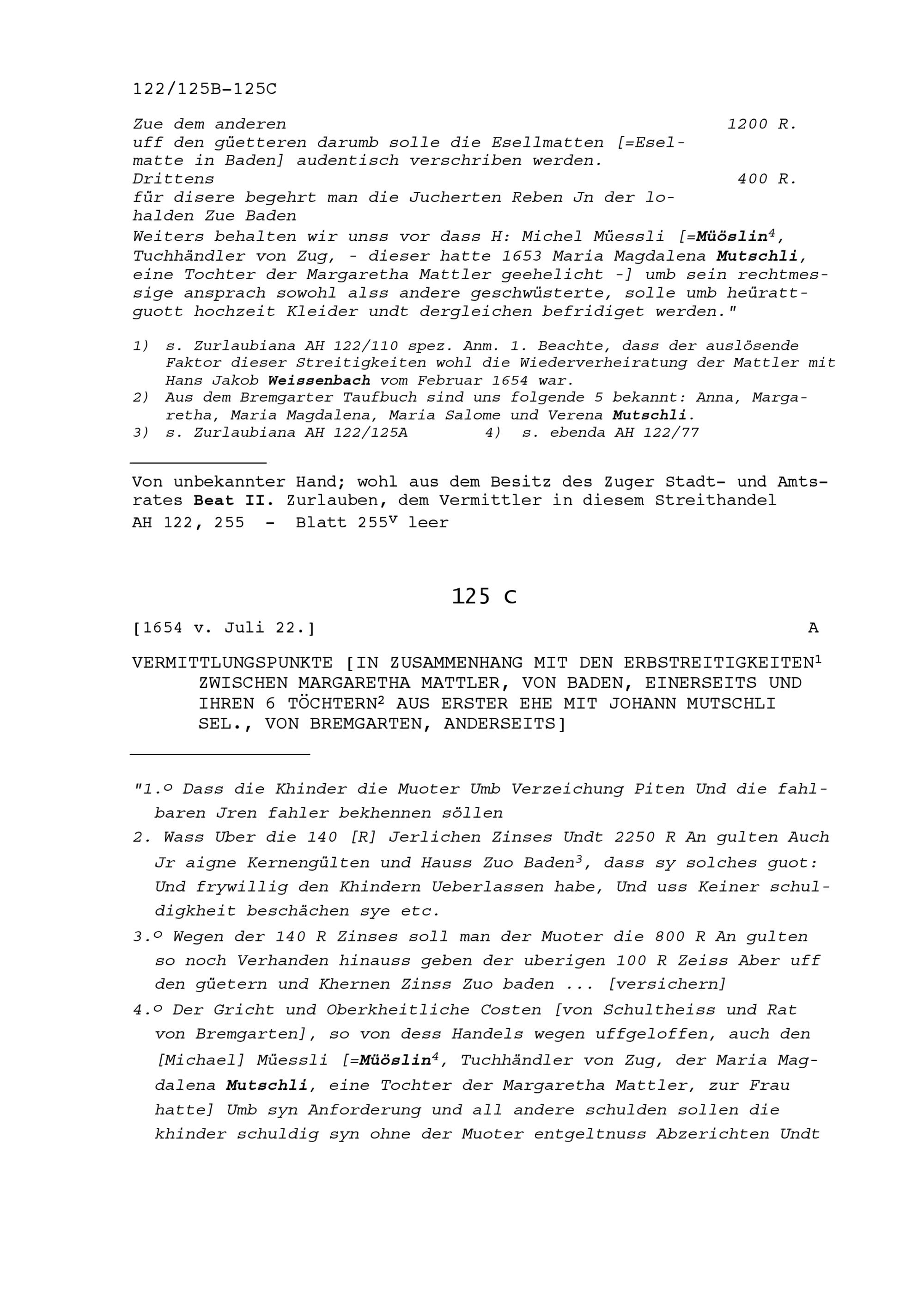 Abrechnung in Zusammenhang mit den Erbstreitigkeiten zwischen Margaretha Mattler, von Baden, und ihren sechs Töchtern aus Erster Ehe mit Johann Mutschli, selig, von Bremgarten, betreffend verschiedener Guthaben der Mattler auf Gütern zu Baden
