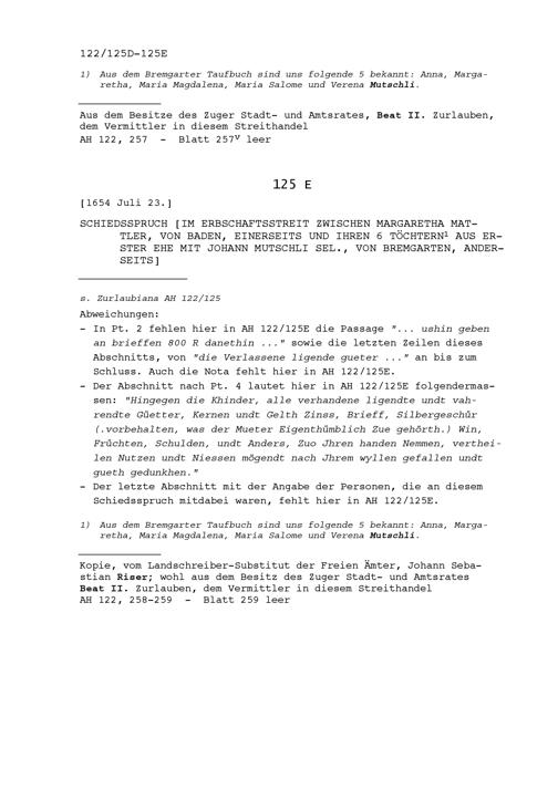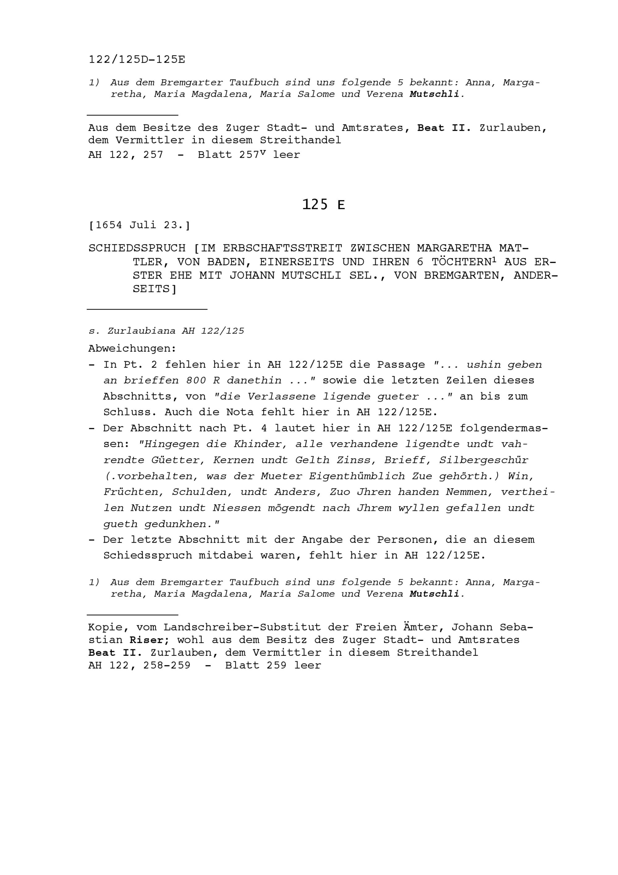 Vermittlungspunkte in Zusammenhang mit den Erbstreitigkeiten zwischen Margaretha Mattler, von Baden, einerseits und ihren sechs Töchtern aus Erster Ehe mit Johann Mutschli, selig, von Bremgarten, anderseits, aufgezeichnet von Karl Weissenbach