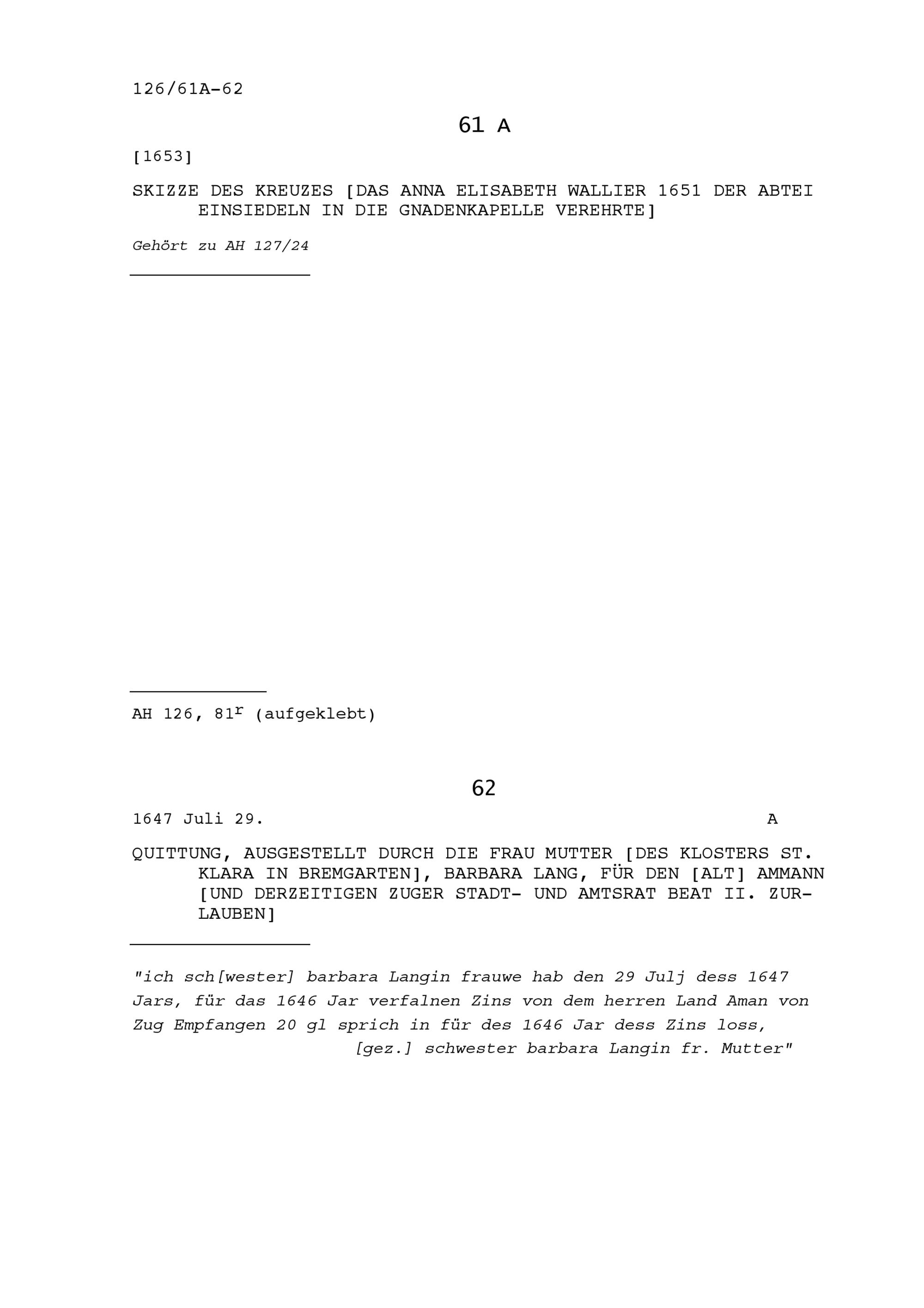Quittung für Beat II. Zurlauben, Altammann und Stadt- und Amtrat Zug, ausgestellt durch Barbara Lang, Frau Mutter des Klosters Sankt Klara in Bremgarten