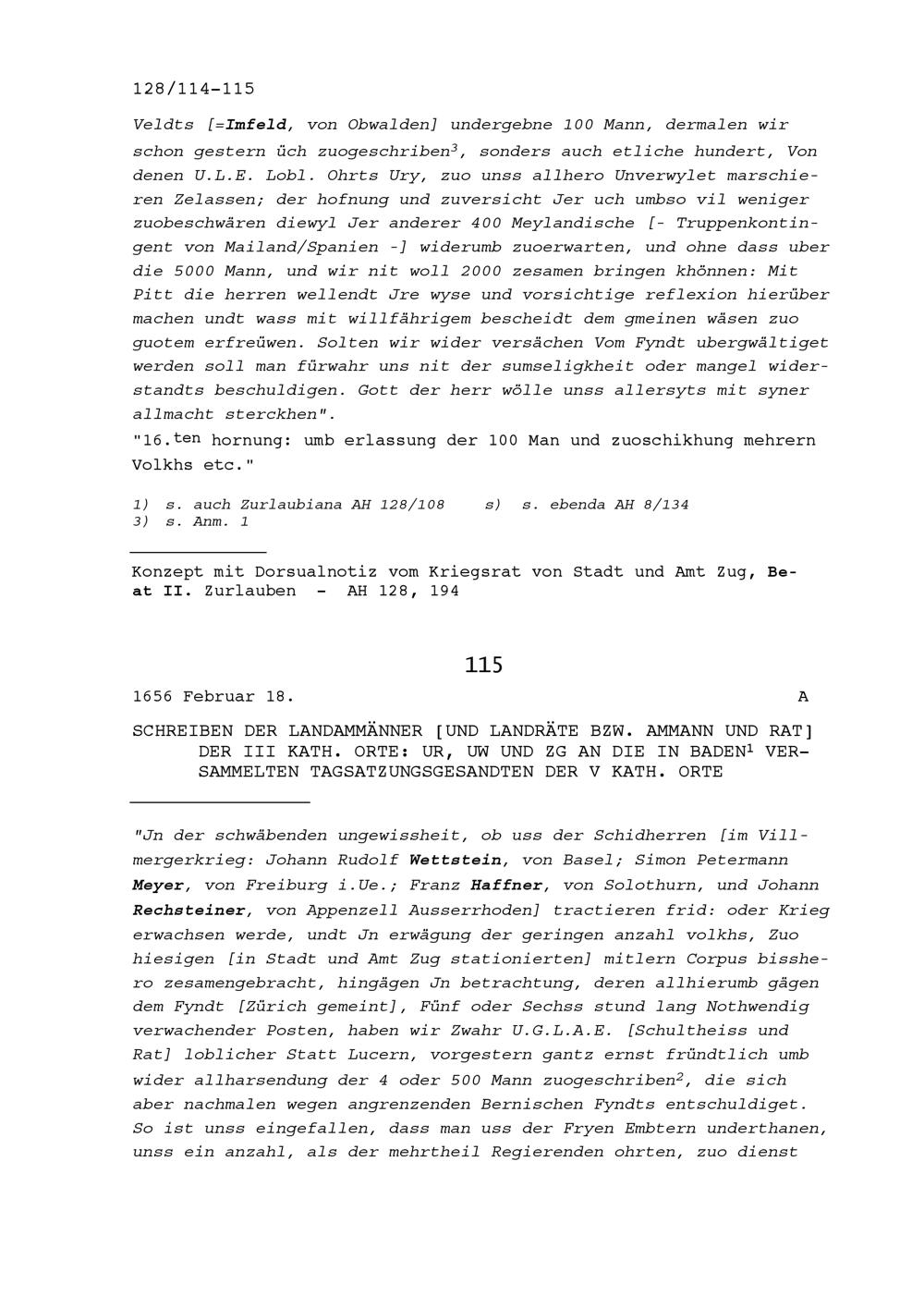 Schreiben der in Zusammenhang mit dem Villmergerkrieg in Zug versammelten Landammänner beziehungsweise des Ammanns, der Landeshauptleute und Kriegsräte der Vier Katholischen Orte an die in Pfäffikon versammelten Häupter und Kriegsräte der Drei Katholischen Orte Uri, Schwyz und Unterwalden