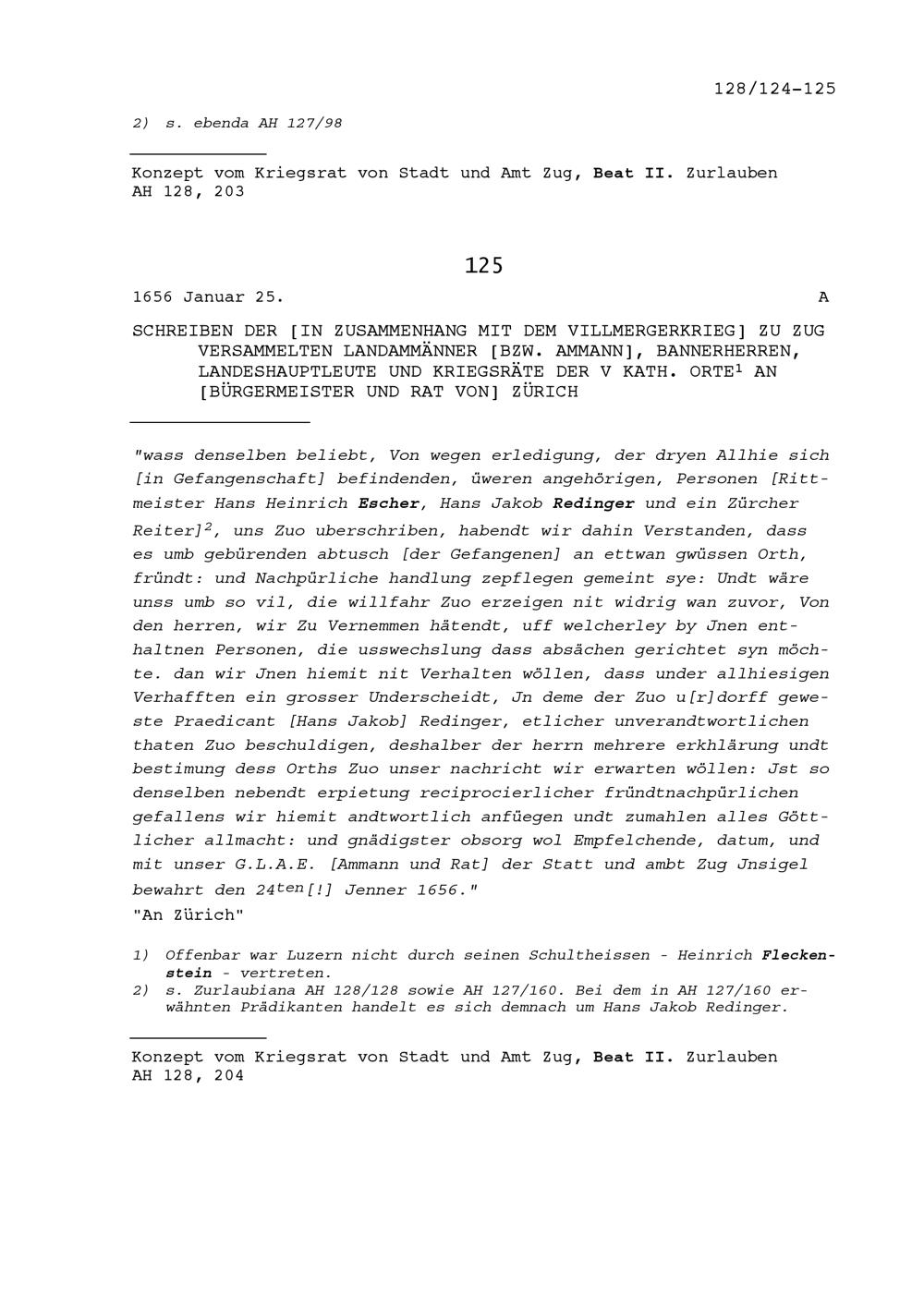Schreiben der in Zusammenhang mit dem Villmergerkrieg in Zug versammelten Landammänner beziehungsweise des Ammanns, der Bannerherren, Landeshauptleute und Kriegsräte der Vier Katholischen Orte an Franz Heinrich Pfyffer, Kommandant von Mellingen