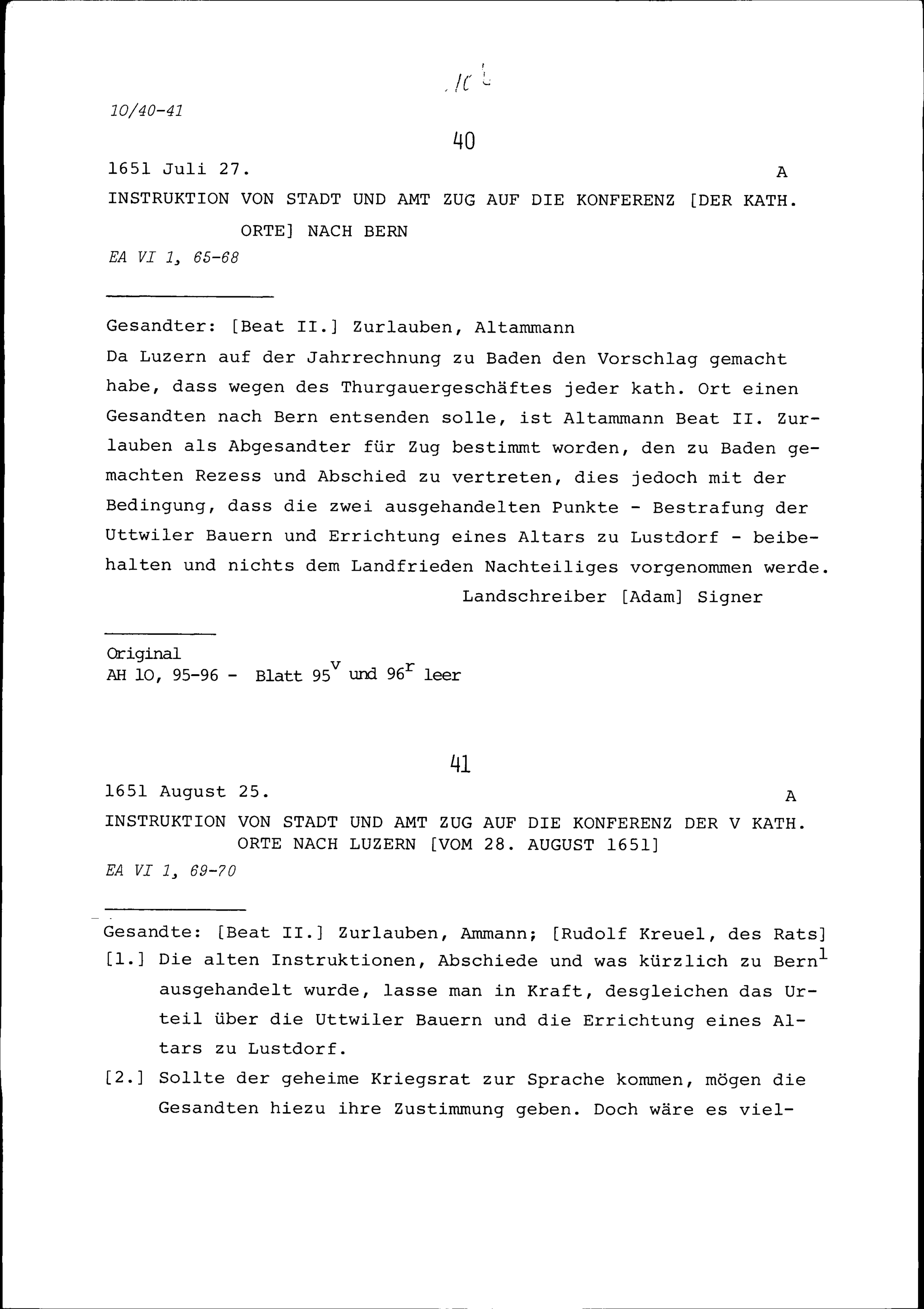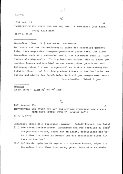 Instruktion von Stadt und Amt Zug auf die Konferenz der Katholischen Orte in Ber...