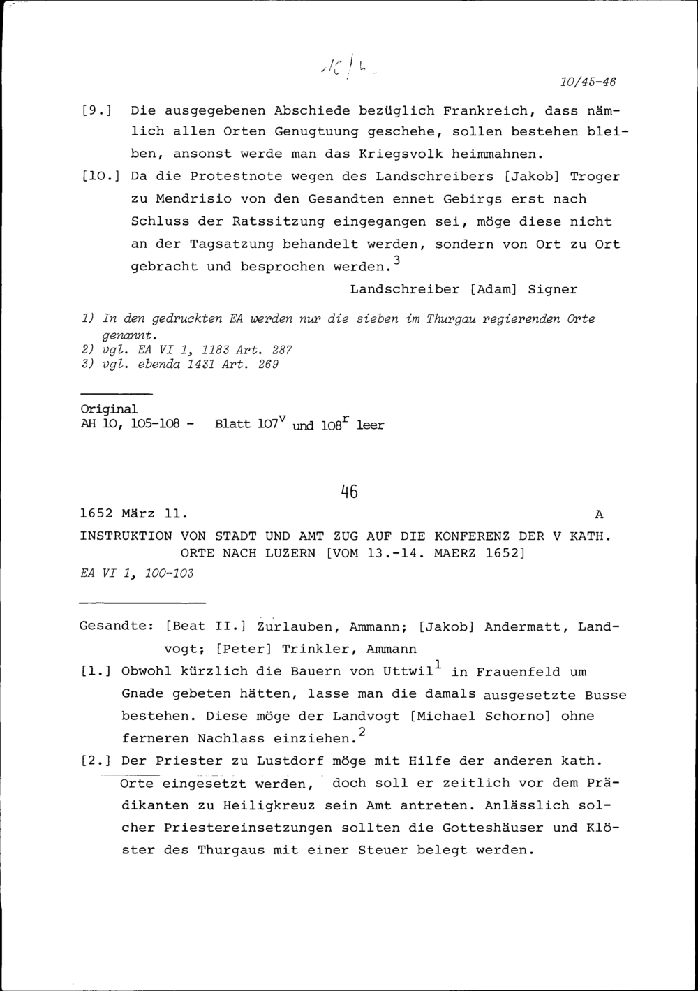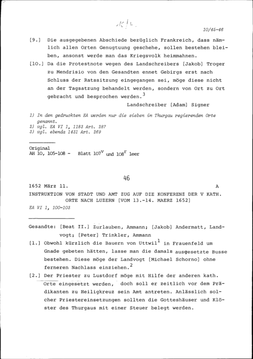 Instruktion von Stadt und Amt Zug auf die Konferenz der Fünf Katholischen Orte in Luzern vom 13. bis 14. März 1652