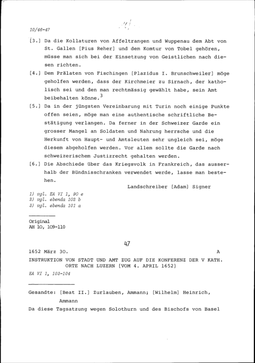 Instruktion von Stadt und Amt Zug auf die Konferenz der Fünf Katholischen Orte in Luzern vom 4. April 1652