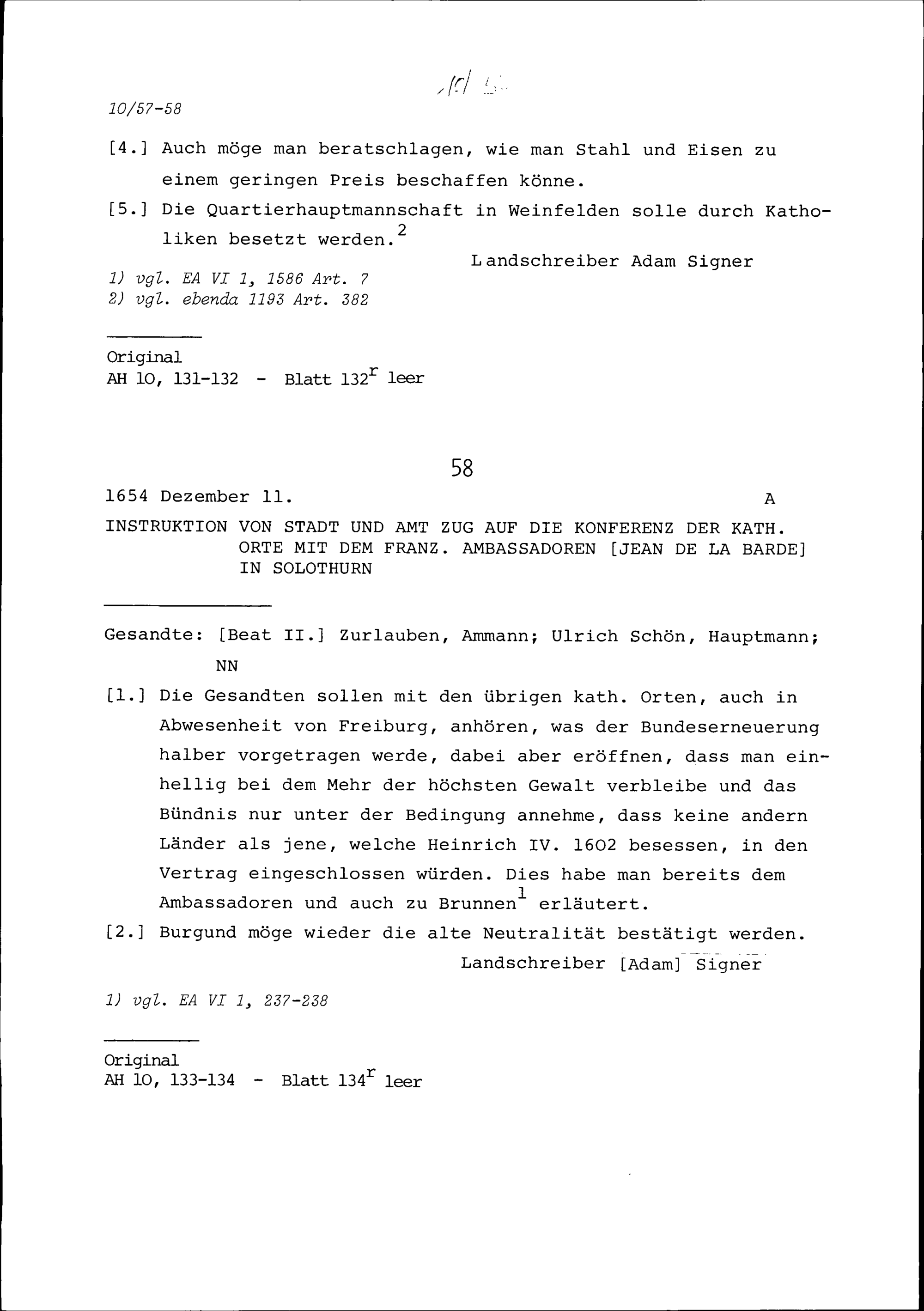 Instruktion von Stadt und Amt Zug auf die Konferenz der Katholischen Orte mit Jean de la Barde, Ambassador von Frankreich, in Solothurn