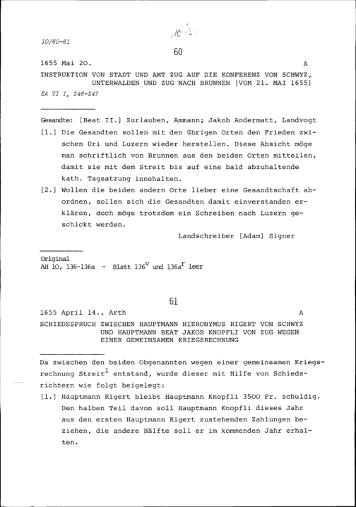 Instruktion von Stadt und Amt Zug auf die Konferenz von Schwyz, Unterwalden und Zug in Brunnen vom 21. Mai 1655