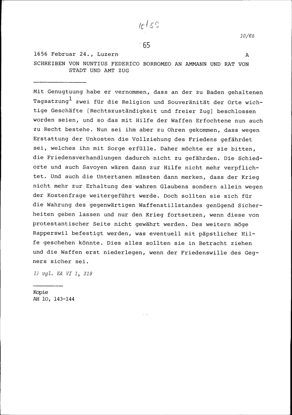 Schreiben von Federico Borromeo, Nuntius, an Ammann und Rat von Stadt und Amt Zug