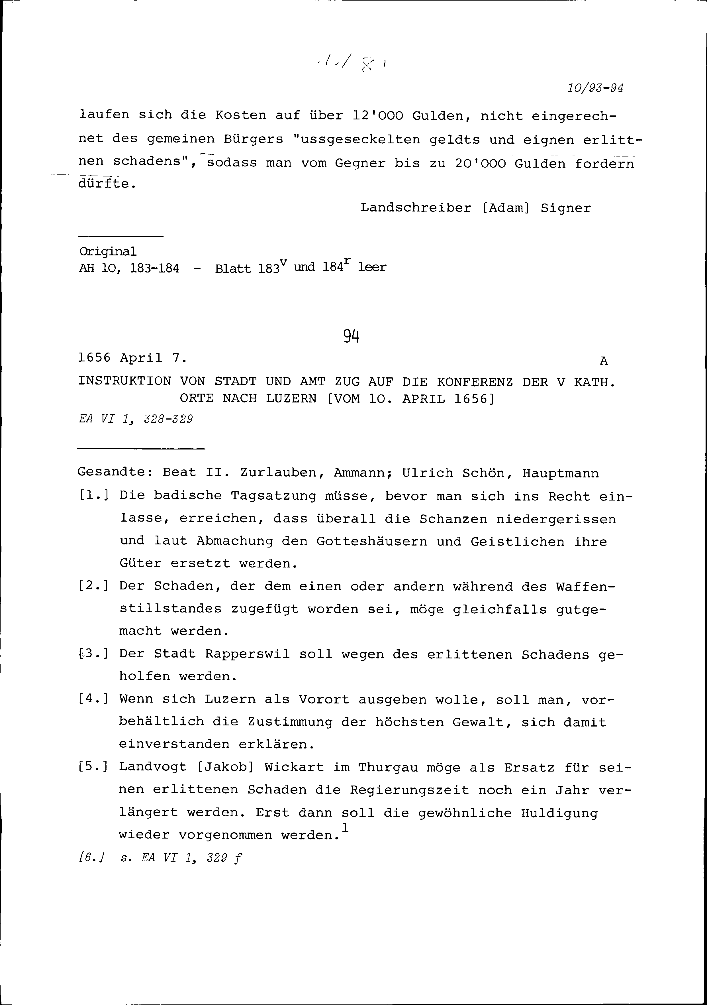 Instruktion von Stadt und Amt Zug auf die Konferenz der Fünf Katholischen Orte in Luzern vom 10. April 1656