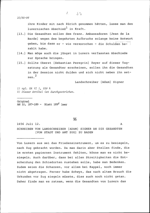 Schreiben von Adam Signer, Landschreiber, an die Gesandten von Stadt und Amt Zug...
