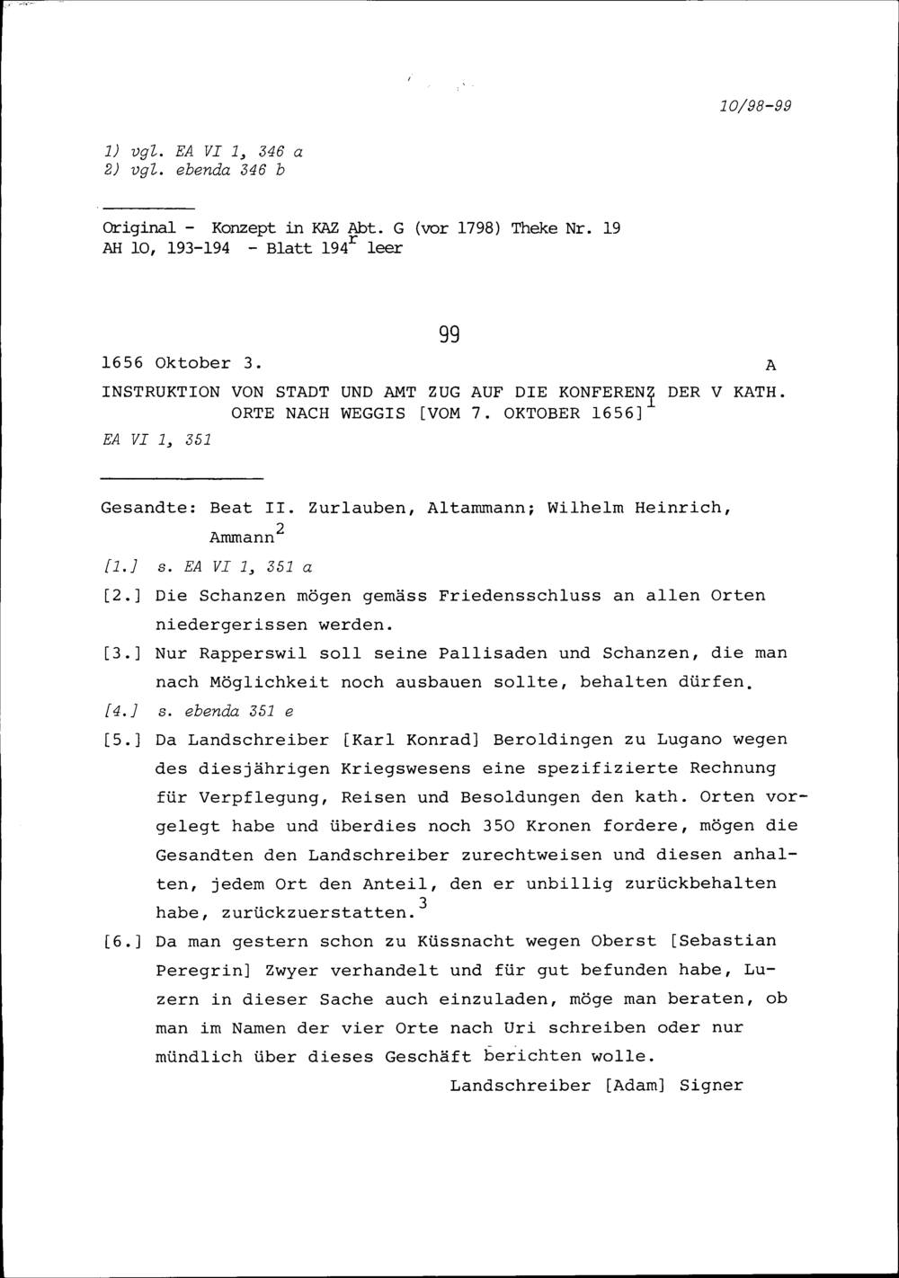 Instruktion von Stadt und Amt Zug auf die Konferenz der Fünf Katholischen Orte in Weggis vom 7. Oktober 1656
