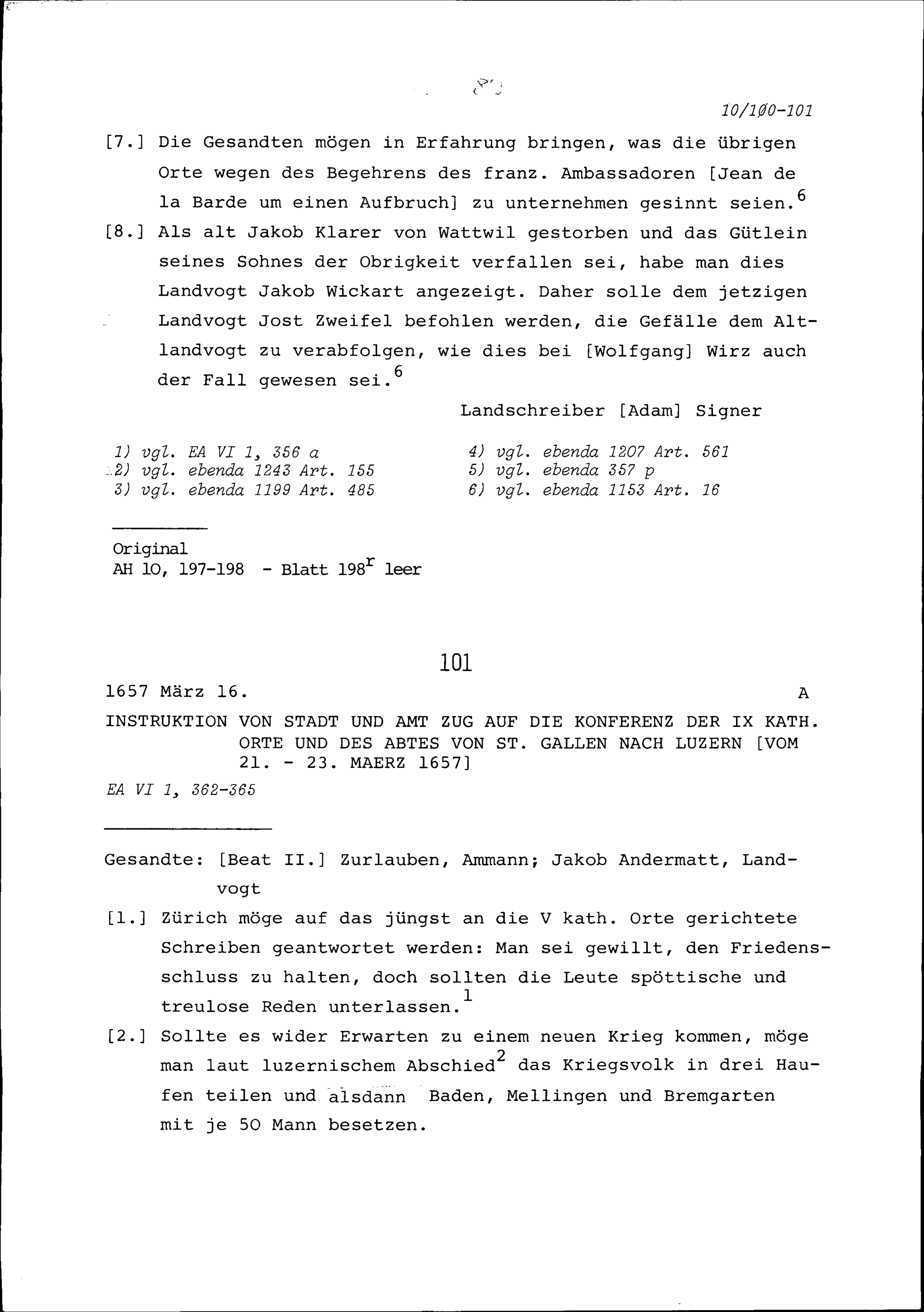 Instruktion von Stadt und Amt Zug auf die Konferenz der Neun Katholischen Orte und des Abtes von Sankt Gallen in Luzern vom 21. bis 23. März 1657