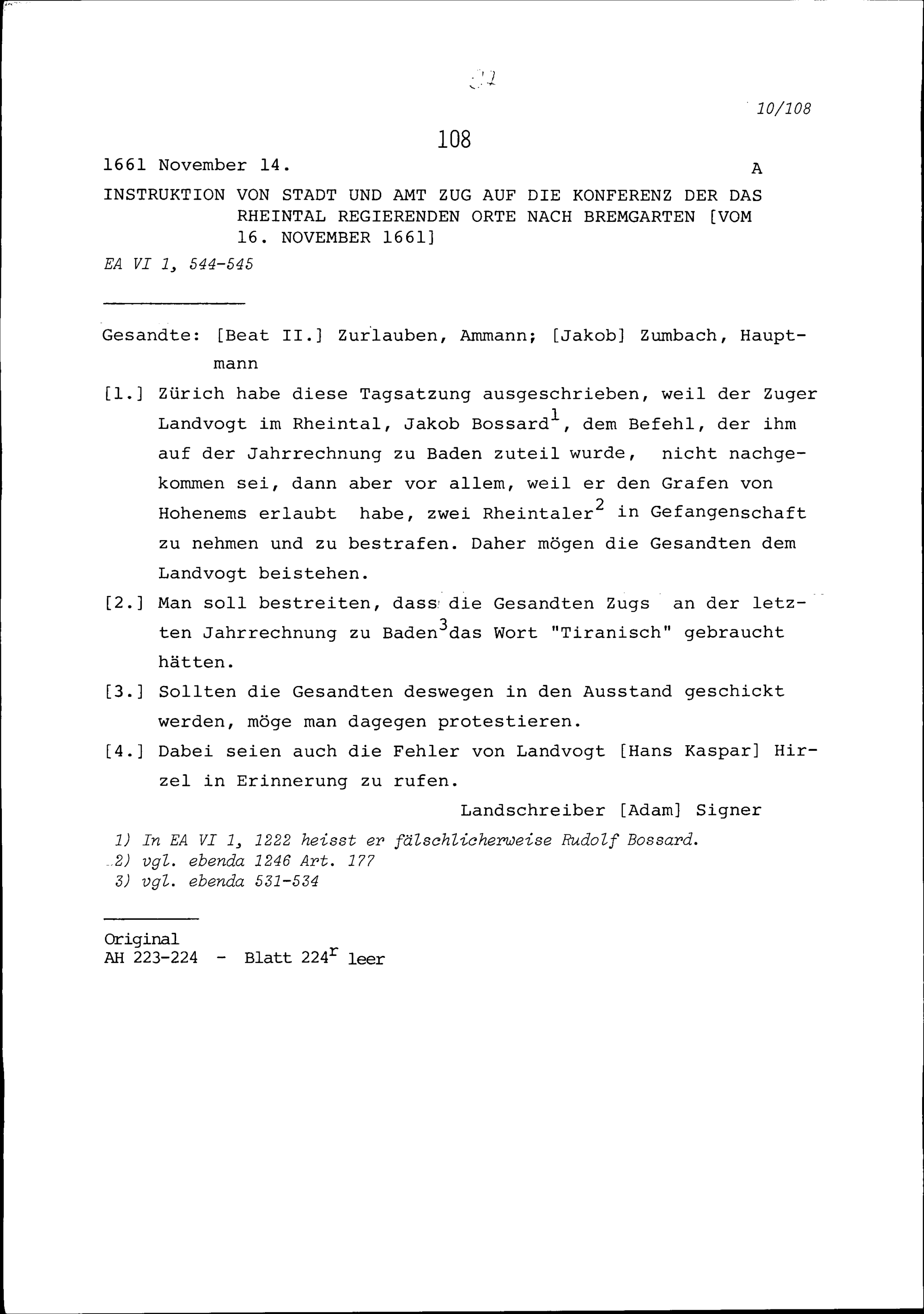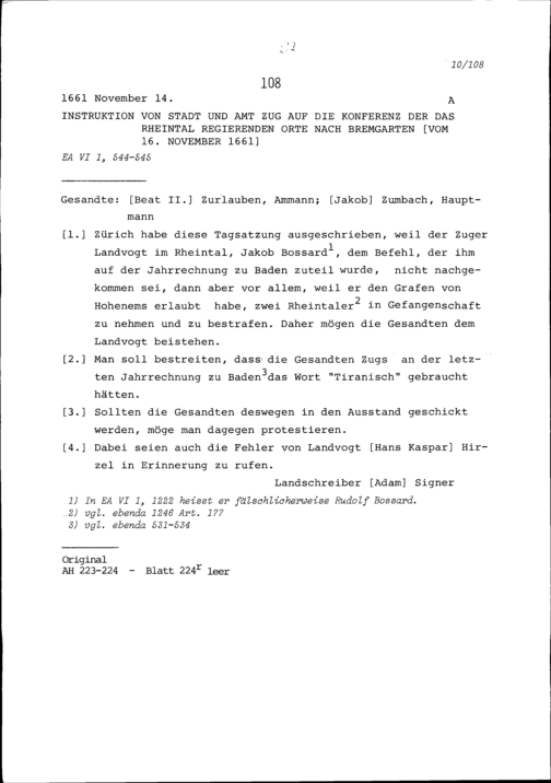 Instruktion von Stadt und Amt Zug auf die Konferenz der das Rheintal regierenden Orte in Bremgarten vom 16. November 1661