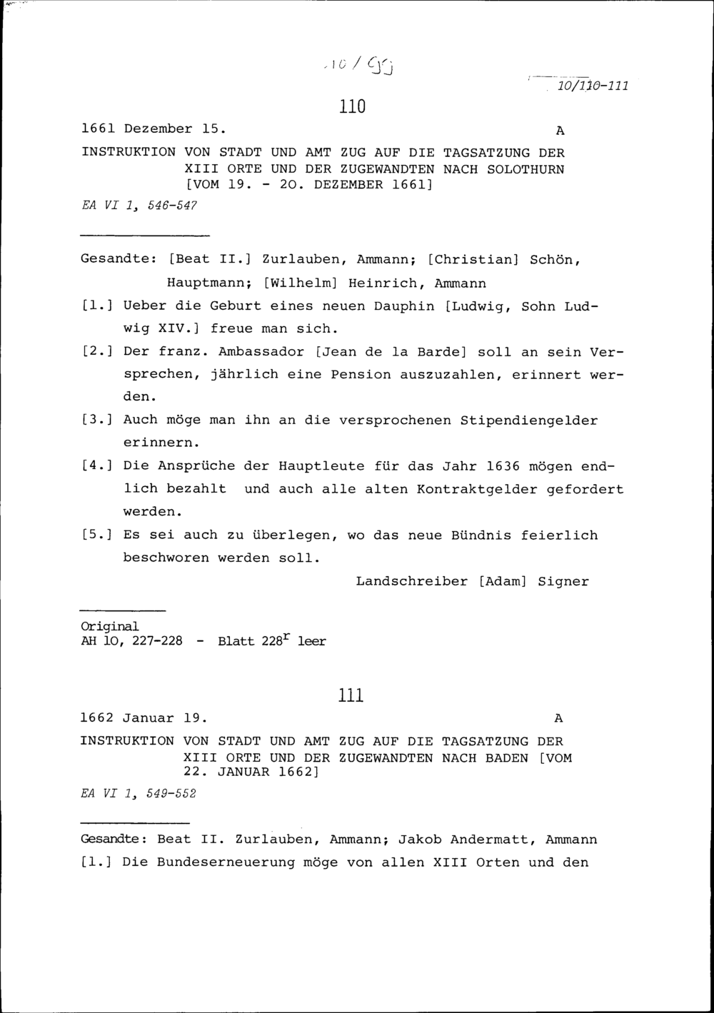 Instruktion von Stadt und Amt Zug auf die Tagsatzung der Dreizehn Orte und der Zugewandten Orte nach Solothurn vom 19. bis 20. Dezember 1661